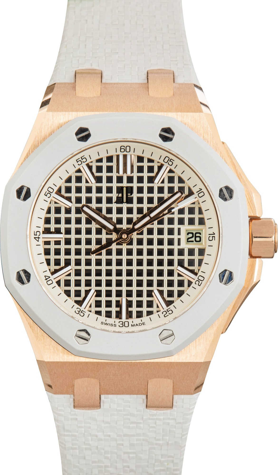 This Audemars Piguet Royal Oak Offshore Selfwinding ref. 77605OK.OO.A101CA.01 combines sporty flair with refined luxury. The 37mm 18k pink gold case pairs with a grey rubber-covered bezel and textured ivory “Grande Tapisserie” dial, creating a bold yet elegant presence. Equipped with Calibre 5900 and finished with a matching grey rubber strap, this Royal Oak Offshore delivers versatile style and Audemars Piguet precision in a compact, striking package.