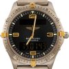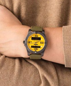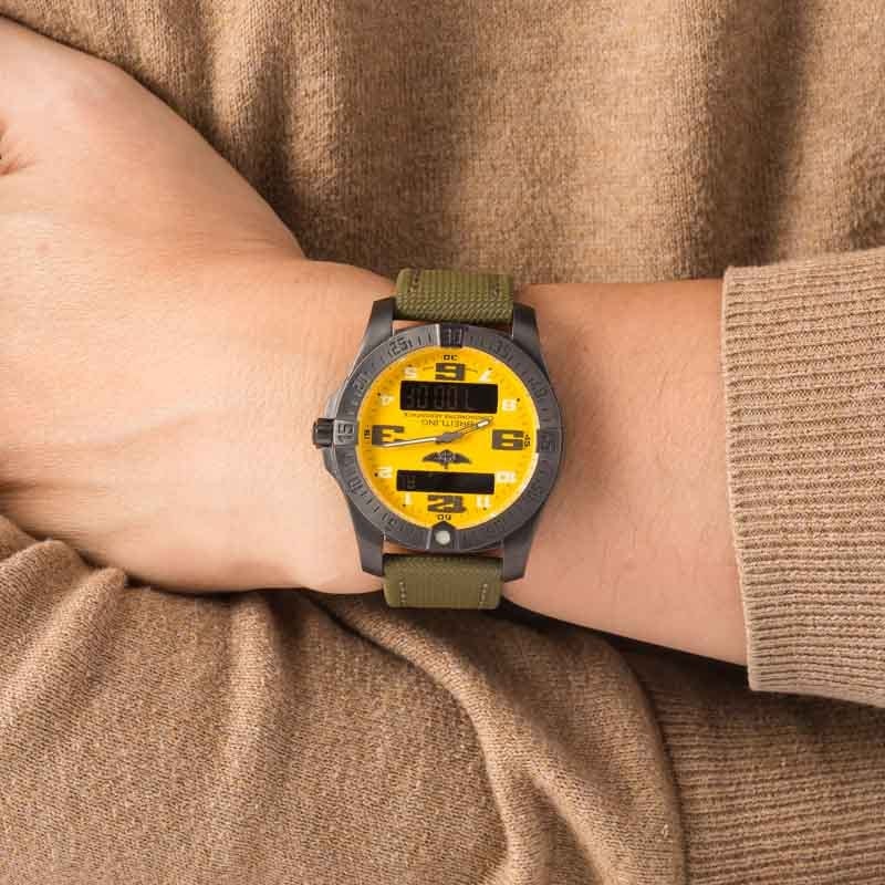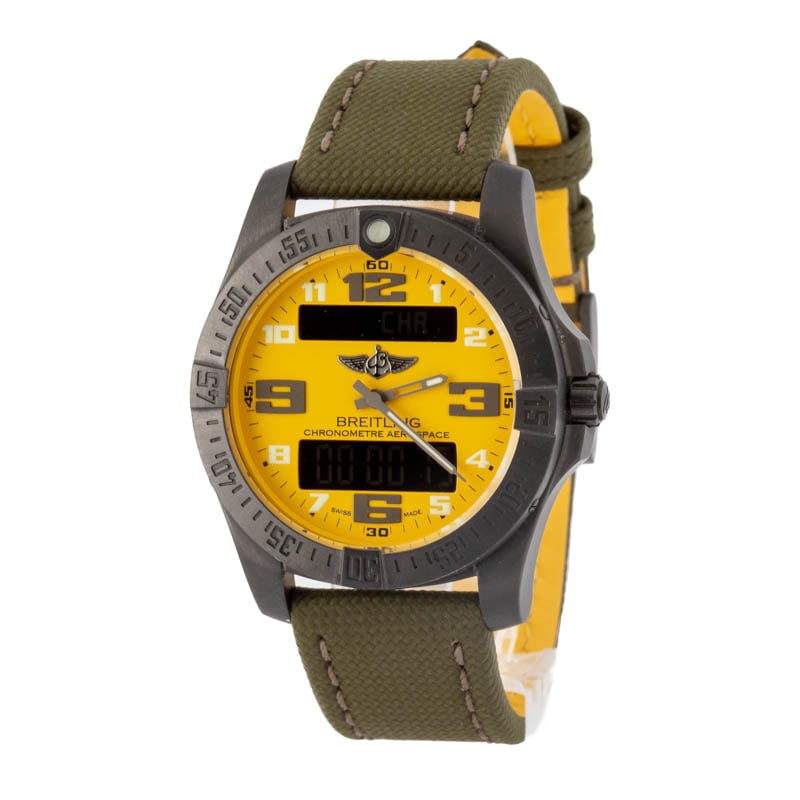 This Breitling Aerospace EVO ref. V793637S/I522 (2013) features a 43mm lightweight titanium case with a unidirectional timing bezel, combining durability with modern design. The yellow Arabic dial integrates both analog hands and a digital display for multifunctional readability. Powered by the Breitling Caliber 79 quartz movement, it offers precision and versatility, while the green hybrid strap provides comfort and a sporty, contemporary look.