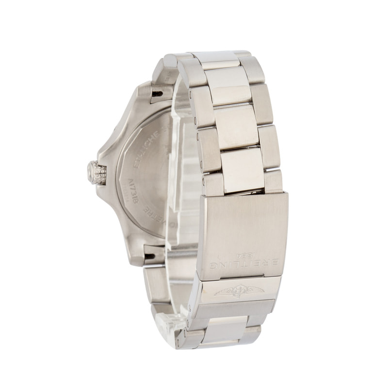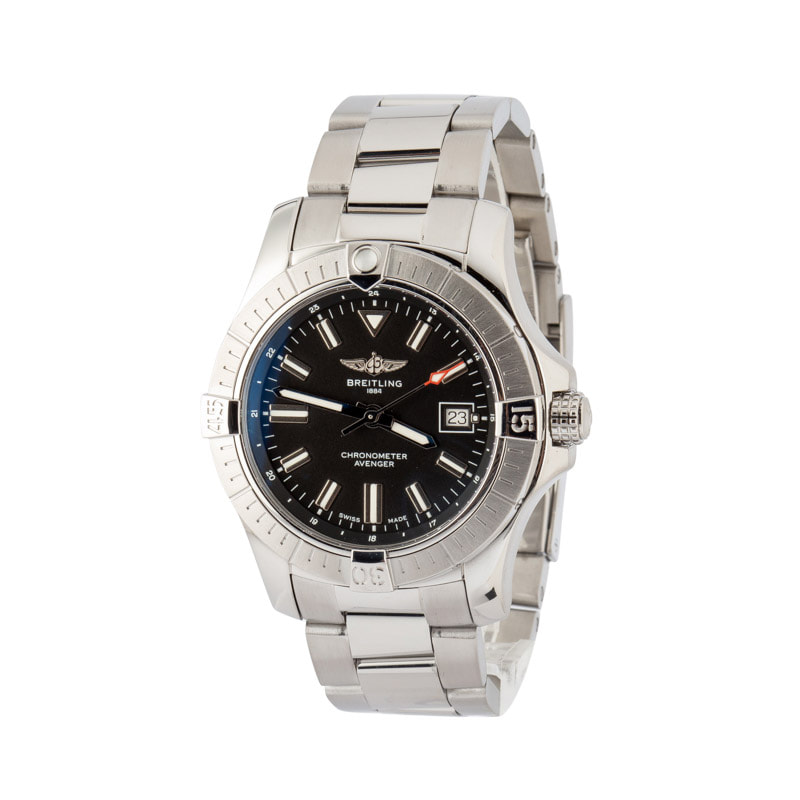 This Breitling Avenger ref. A17318101B1A1 (2020) comes in a 43mm stainless steel case with a matching bracelet and a unidirectional timing bezel. The black index dial includes a date window at 3 o’clock, and the watch is powered by the Breitling Caliber 17 automatic movement, offering reliable performance and everyday versatility.