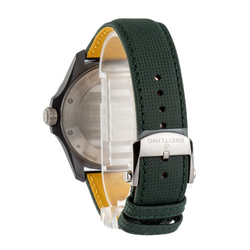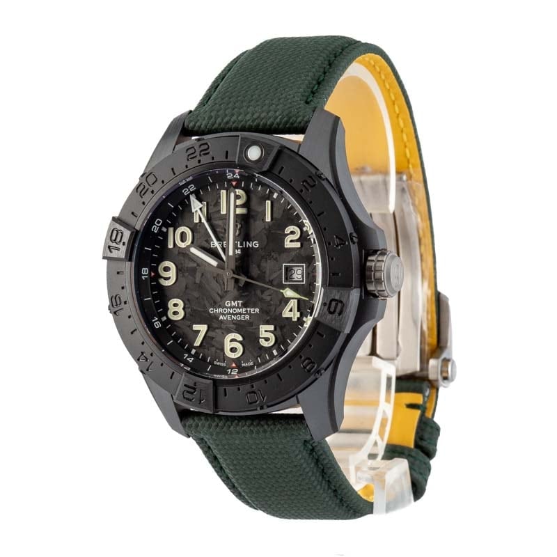 Built for global explorers, this Breitling Avenger Automatic GMT 44 Night Mission ref. S32320101B1X1 (2024) is a rugged yet sophisticated timepiece designed for those who navigate multiple time zones. Its ultra-durable 44mm ceramic case, paired with a rotating pinion bezel featuring a 24-hour scale, ensures seamless tracking of 2nd and 3rd time zones. Powered by the Breitling 32 caliber, this self-winding mechanical movement delivers precision with a 42-hour power reserve. Engineered for extreme conditions, it boasts 300m water resistance, a screw-locked crown, and a glareproofed sapphire crystal. The bold black dial enhances legibility, while the green strap with a titanium folding clasp adds a distinctive, adventure-ready edge.