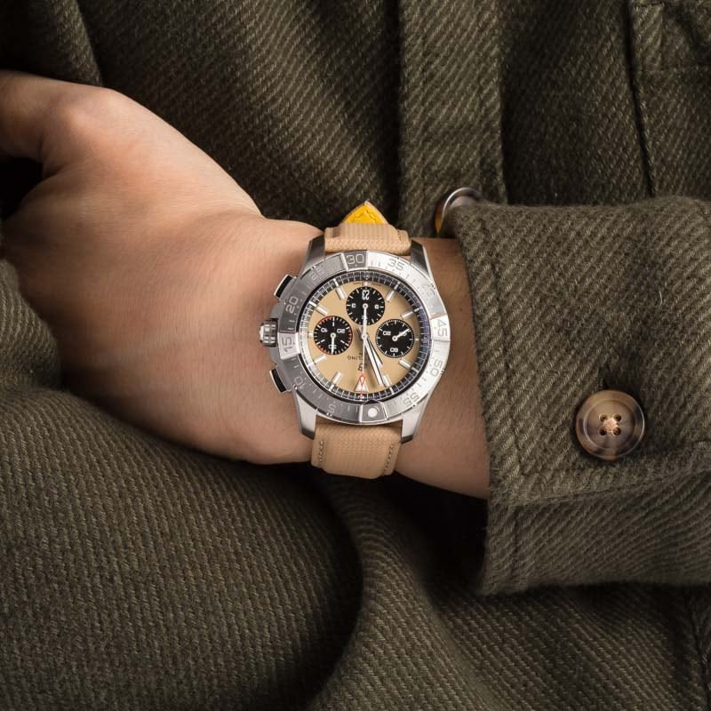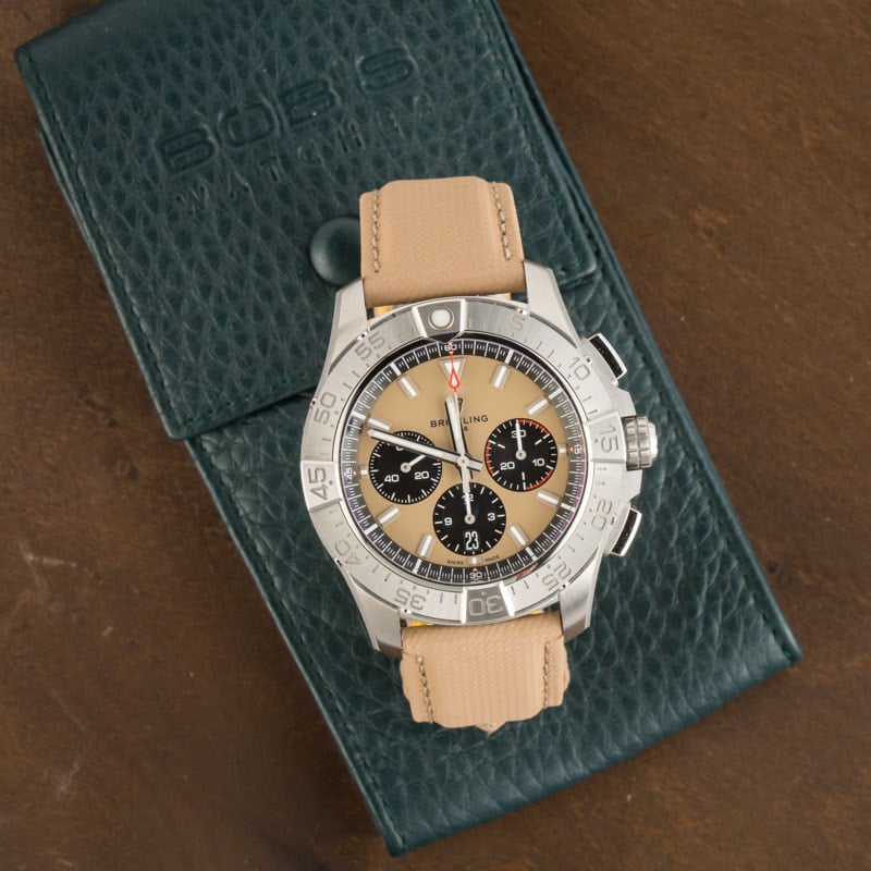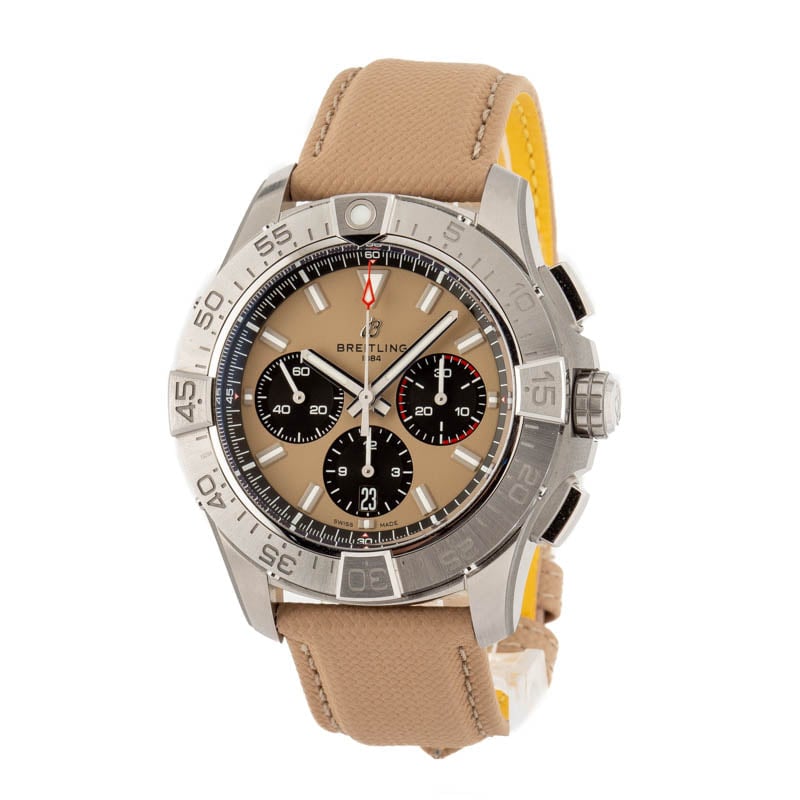 Unworn and built for adventure, this Breitling Avenger B01 Chronograph 44 ref. AB0147101A1X1 combines military-grade performance with refined craftsmanship. Powered by the in-house Breitling 01 movement with a 70-hour power reserve, this stainless steel chronograph boasts 300m water resistance, a glareproof sapphire crystal, and a rugged unidirectional bezel. The crisp beige dial is matched with a sand-colored leather strap and stainless steel folding clasp, delivering a perfect blend of utility and style for those who live boldly and demand precision in every moment.