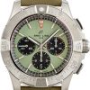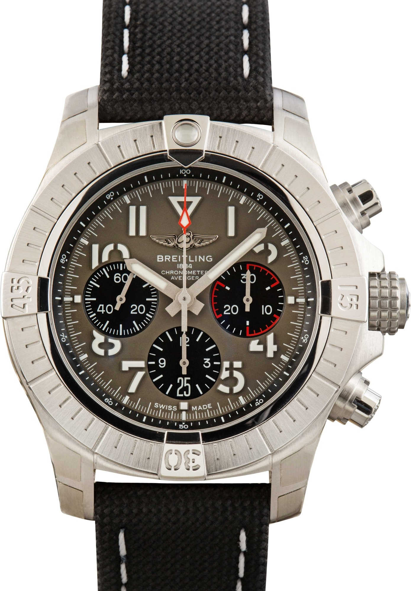 Breitling Avenger B01 Chronograph 45 ref. AB01821A1B1X2 (2022) is a bold 45mm stainless steel chronograph built for performance. Powered by the Breitling Manufacture Caliber 01 self-winding movement with a 70-hour power reserve, 47 jewels, and a 1/4th second chronograph with 30-minute and 12-hour totalizers, it delivers precision under pressure. Features include a screw-locked crown, unidirectional ratcheted bezel, cambered sapphire crystal glareproofed on both sides, and water resistance to 300 meters (1,000 ft). Completing the look is an anthracite leather strap with a stainless steel pushbutton folding clasp, combining rugged durability with refined style.