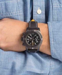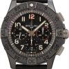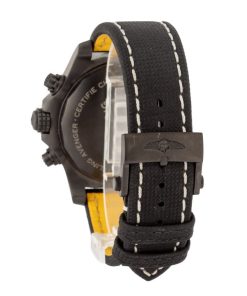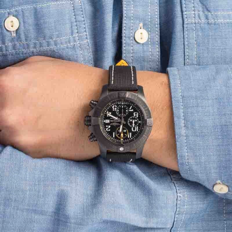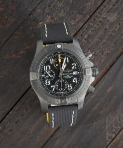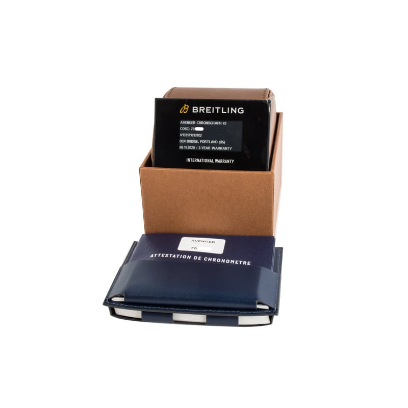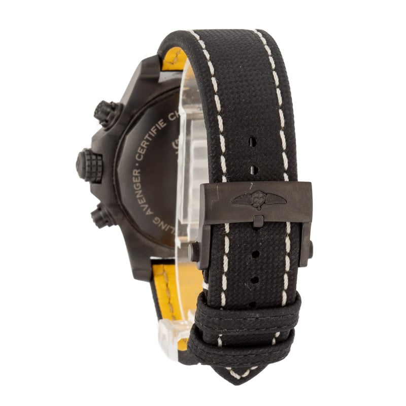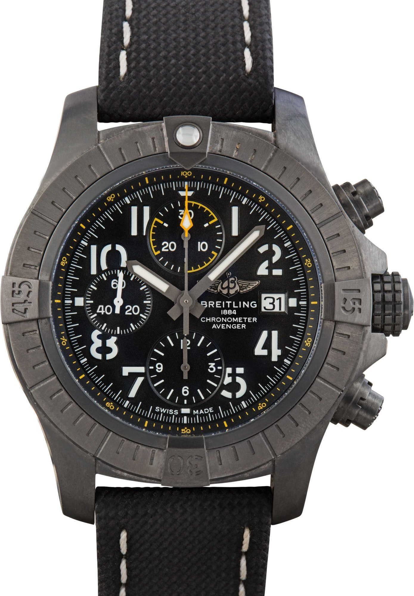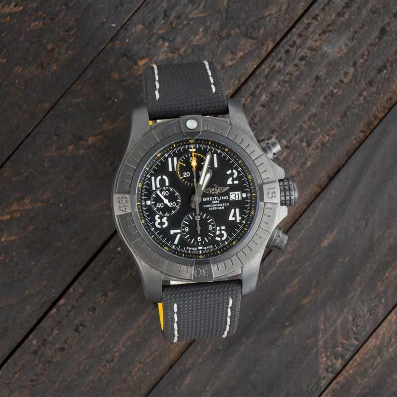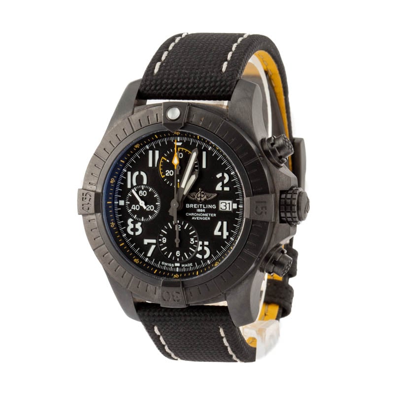 This Breitling Avenger Chronograph 45 Night Mission ref. V13317101B1X2 (2020) features a bold 45mm DLC-coated titanium case with a black timing bezel, delivering a rugged, tactical aesthetic. The black Arabic numeral dial includes three subdials and a date window at 3 o’clock, ensuring practical functionality. Paired with a black calfskin leather strap, this chronograph is powered by the Breitling Caliber 13, offering robust performance suited for demanding conditions.