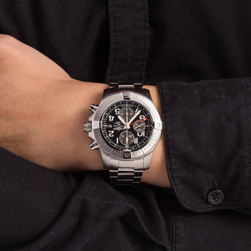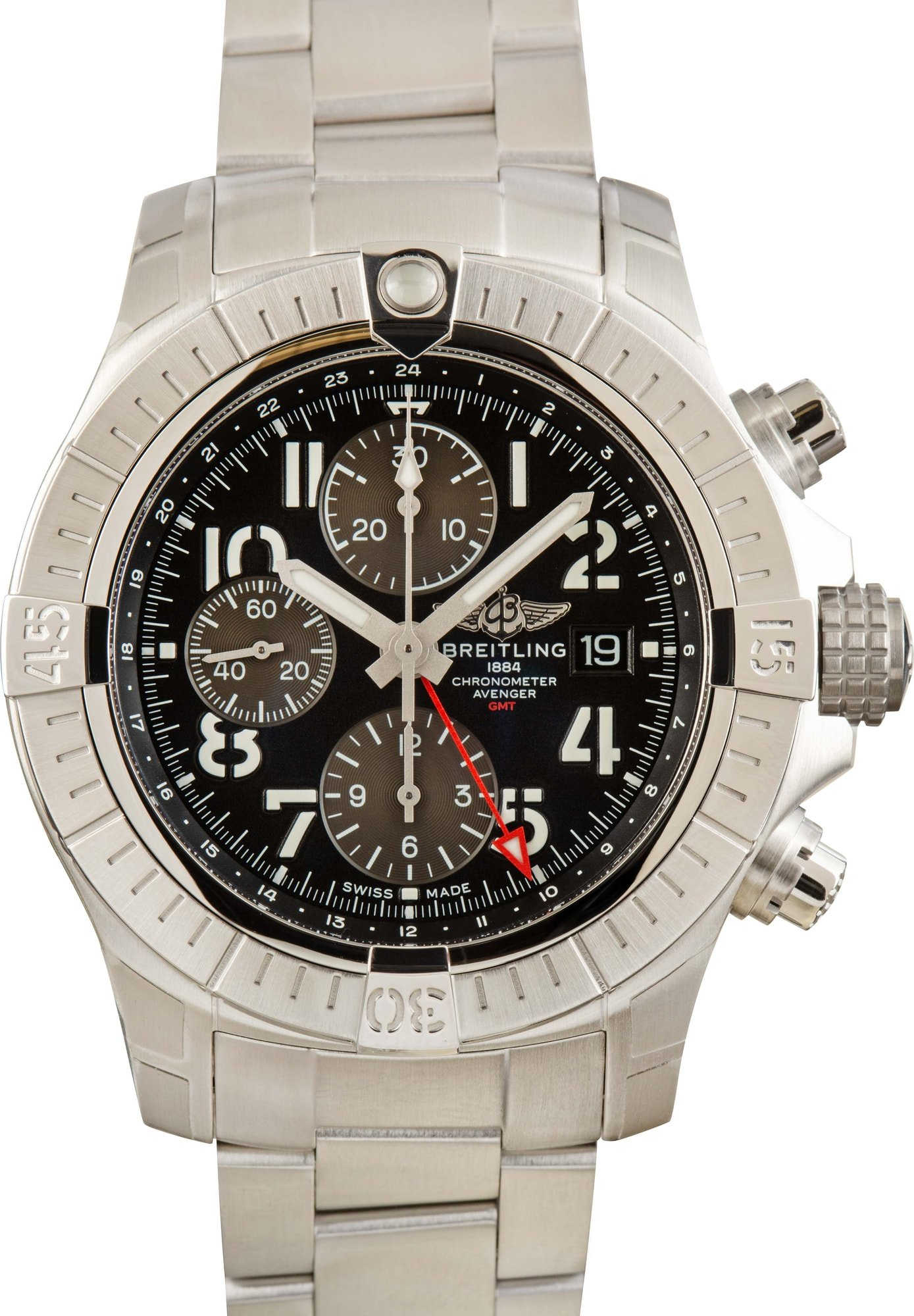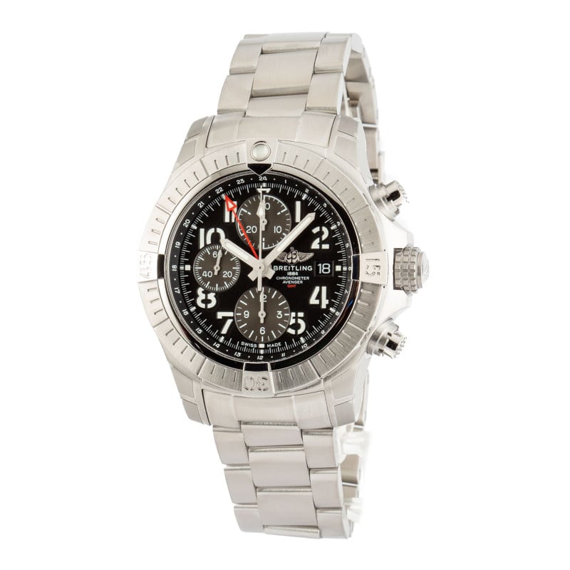 Discover the perfect blend of precision and durability with this , unworn Breitling Avenger Chronograph GMT 45 ref. A24315101B1A1. This robust timepiece is powered by the Breitling 24 self-winding movement, featuring a 42-hour power reserve, 25 jewels, and a second timezone display. With its chronograph functionality measuring up to 12 hours, 30 minutes, and 1/4th second, this watch is built for performance. Its 45mm stainless steel case is water-resistant up to 300 meters, equipped with a unidirectional rotating bezel, and a cambered sapphire crystal to ensure maximum durability. The screw-locked crown, metal bracelet, and striking design make this a versatile, must-have luxury watch for any collection.