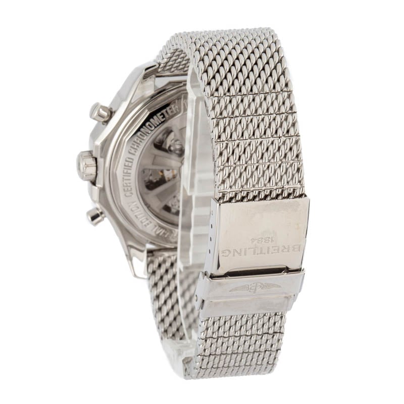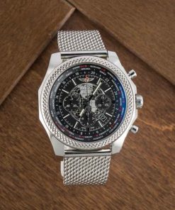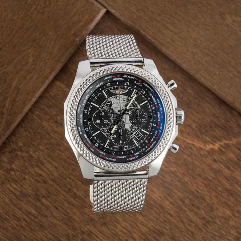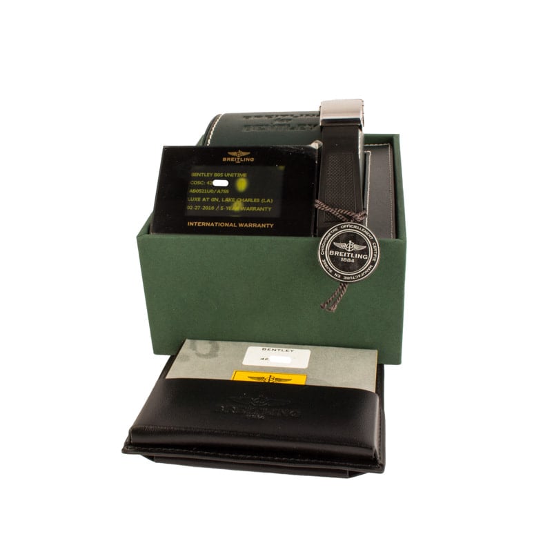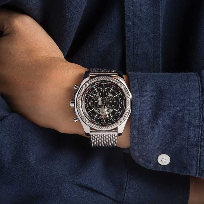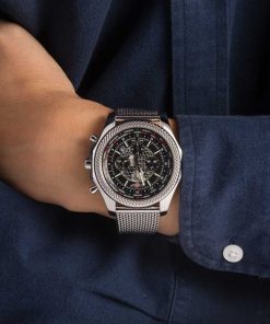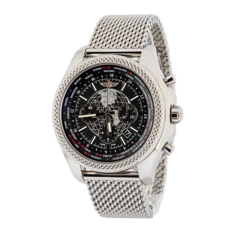 This Breitling for Bentley ref. AB0521U0/A755 (2014) features an impressive 49mm stainless steel case and bracelet, combining bold design with technical sophistication. The black dial showcases a GMT world time function with a rotating disc displaying 24 global cities and an AM/PM indicator for effortless time zone tracking. Equipped with chronograph and date functions, it’s powered by the in-house Breitling Caliber B05, delivering exceptional precision and performance. With its signature slide rule bezel and intricate detailing, this Bentley model embodies luxury engineering and global functionality.