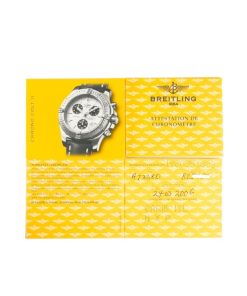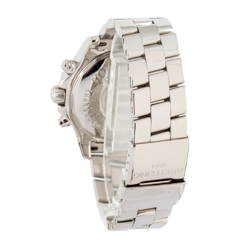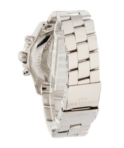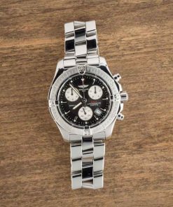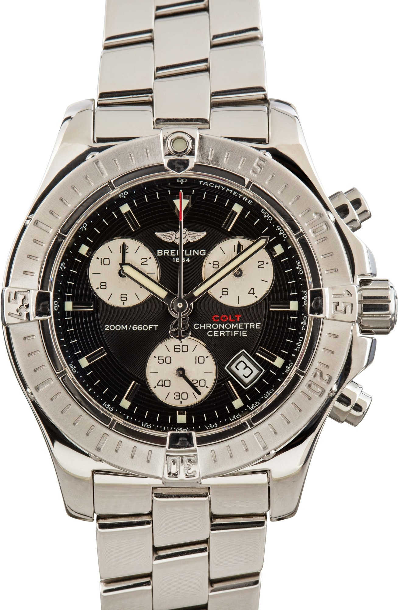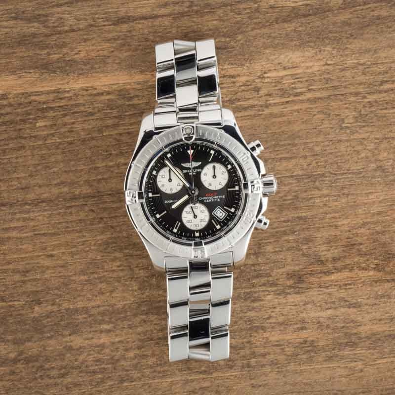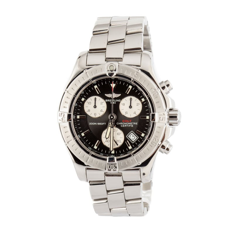 This Breitling Colt ref. A73380 (2006) comes in a 41.5mm stainless steel case with a matching steel bracelet and a unidirectional timing bezel. The black dial features silver index markers, three subdials, and a date window at 4:30, offering both sporty style and functionality. Powered by a reliable quartz movement, this Colt is a durable and precise everyday chronograph.
