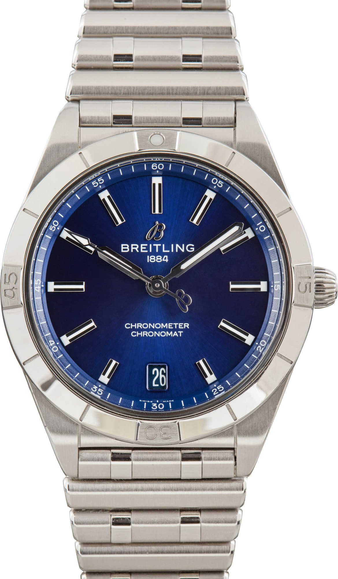 This Breitling Chronomat ref. A10380101C1A1 (2022) combines sporty elegance with everyday versatility. Housed in a 36mm stainless steel case, it features a unidirectional timing bezel and a striking blue index dial with a date display at 6 o’clock. Powered by the Breitling Caliber 10 automatic movement, this timepiece delivers reliable precision. The stainless steel bracelet adds to its refined aesthetic, making it a perfect choice for those who appreciate both function and style.