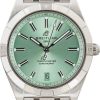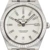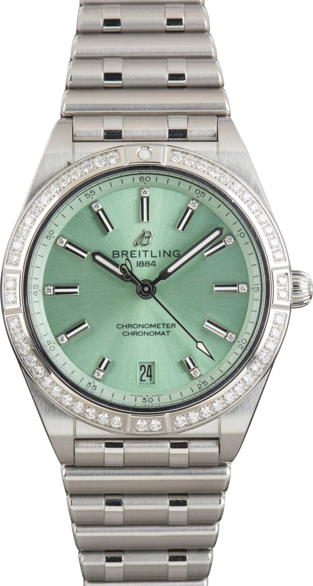 This Breitling Chronomat ref. A10380591L1A1 (2021) features a 36mm stainless steel case with a diamond-set bezel, combining elegance with sporty appeal. The green index and diamond-accented dial includes a date window at 6 o’clock, adding both style and functionality. Powered by the Breitling 10 automatic movement, it offers reliable performance, while the stainless steel bracelet completes this versatile and refined timepiece.