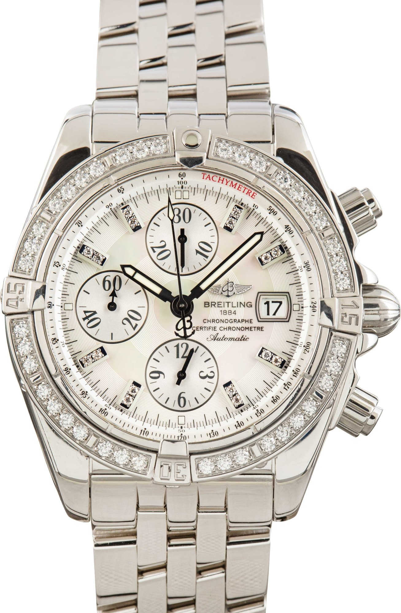 This Breitling Chronomat Evolution ref. A13356 (2007) features a 42mm stainless steel case and bracelet with a diamond-set timing bezel, adding a luxurious touch to its robust chronograph design. The mother-of-pearl dial is adorned with diamond hour markers, combining elegance with functionality. Powered by the Breitling Caliber 13 automatic movement, this Chronomat Evolution delivers reliable performance and timeless style.