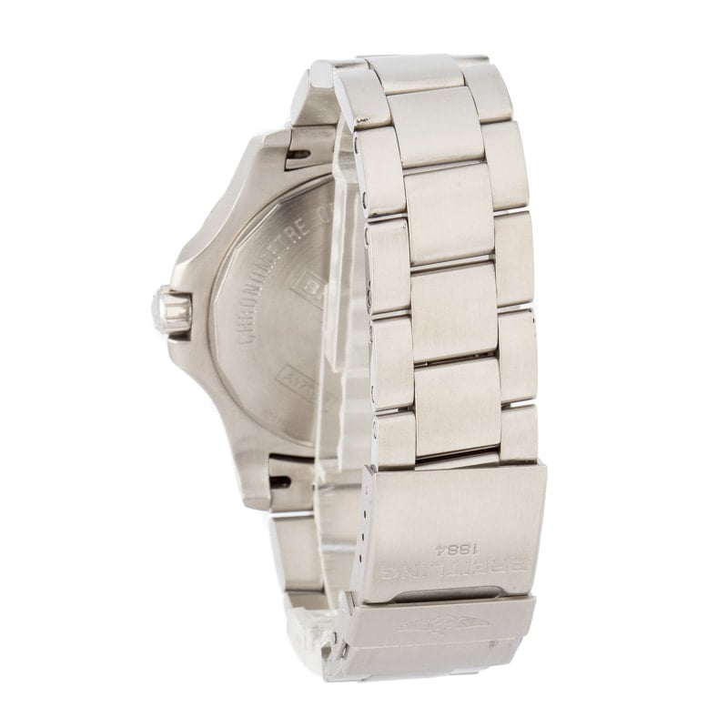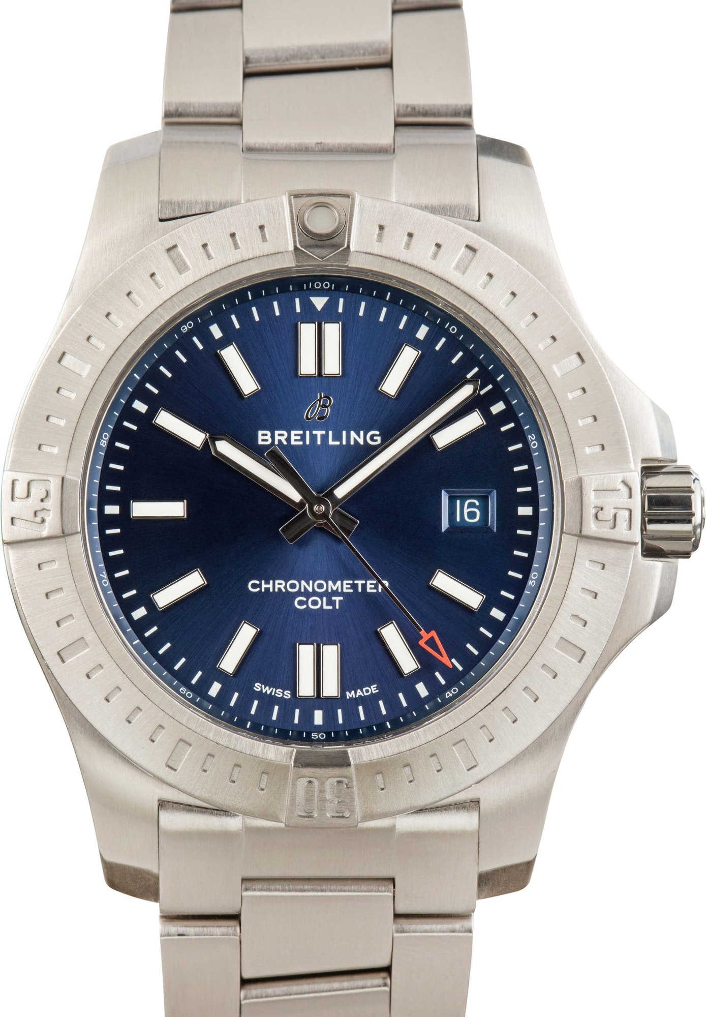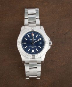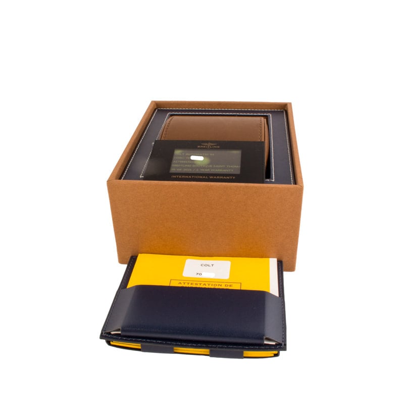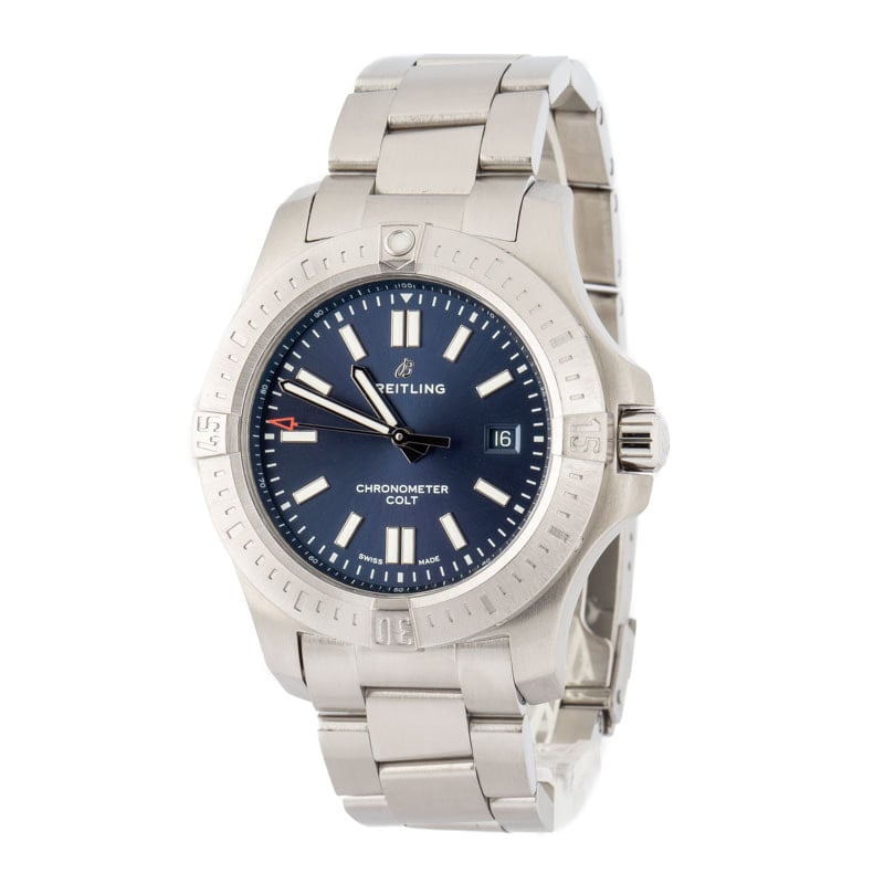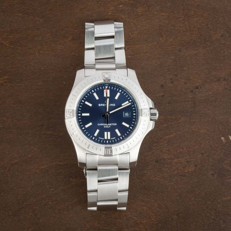 This Breitling Colt 44 ref. A17388101C1X2 (2018) is a robust and versatile sports watch built with a 44mm stainless steel case and unidirectional ratcheted timing bezel. The blue index dial is accented with luminous markers, a date display at 3 o’clock, and oversized hands for strong legibility. Powering the watch is the Breitling Caliber 17 automatic movement, a COSC-certified chronometer with a 38-hour power reserve. While this reference originally came fitted on a leather strap, this example has been upgraded to a stainless steel bracelet, giving it a more substantial wrist presence and everyday durability. Water resistant to 200 meters, this Colt embodies Breitling’s rugged tool-watch spirit with a refined modern design.
