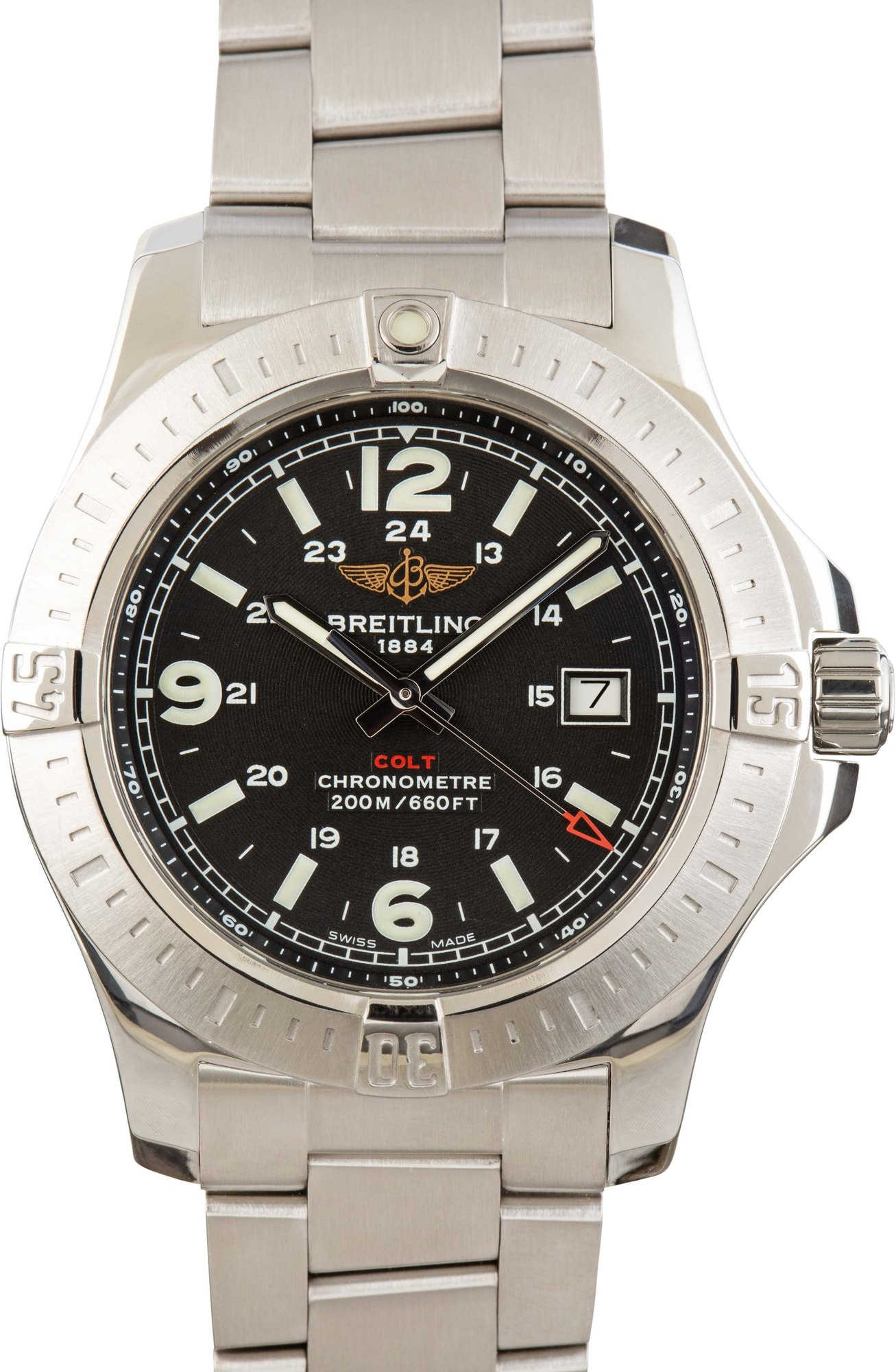 This Breitling Colt ref. A7438811/BD45 from 2017 combines robust design with precise functionality. It features a 44mm stainless steel case, complemented by a unidirectional rotating bezel with a 60-minute scale, ideal for timing events. The black dial is enhanced by luminescent Arabic numeral hour markers and sword-shaped hands, ensuring excellent readability. Equipped with Breitling’s Quartz movement, this timepiece offers exceptional accuracy, being ten times more precise than standard quartz movements. Water-resistant up to 200 meters, the Colt is both durable and reliable, making it a valuable addition to any collection.