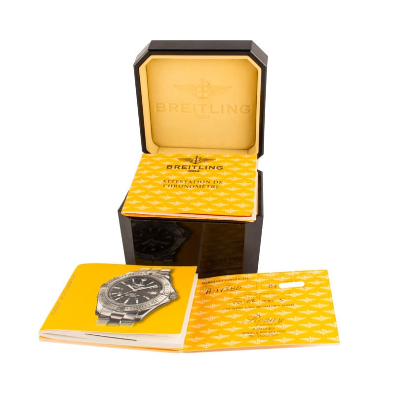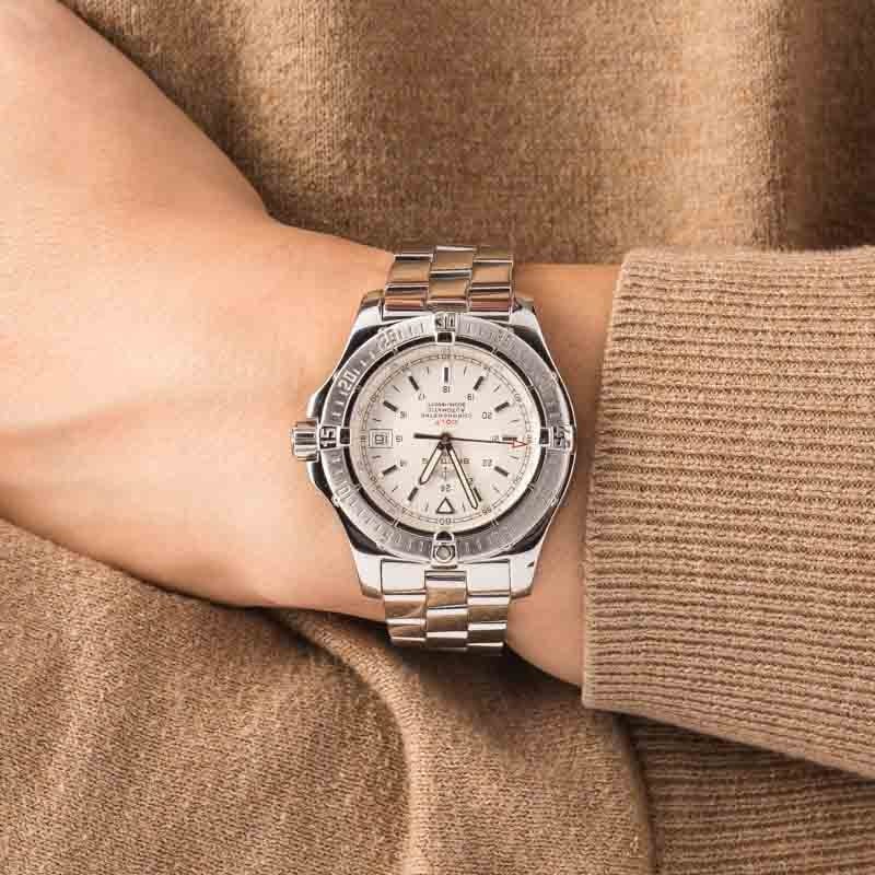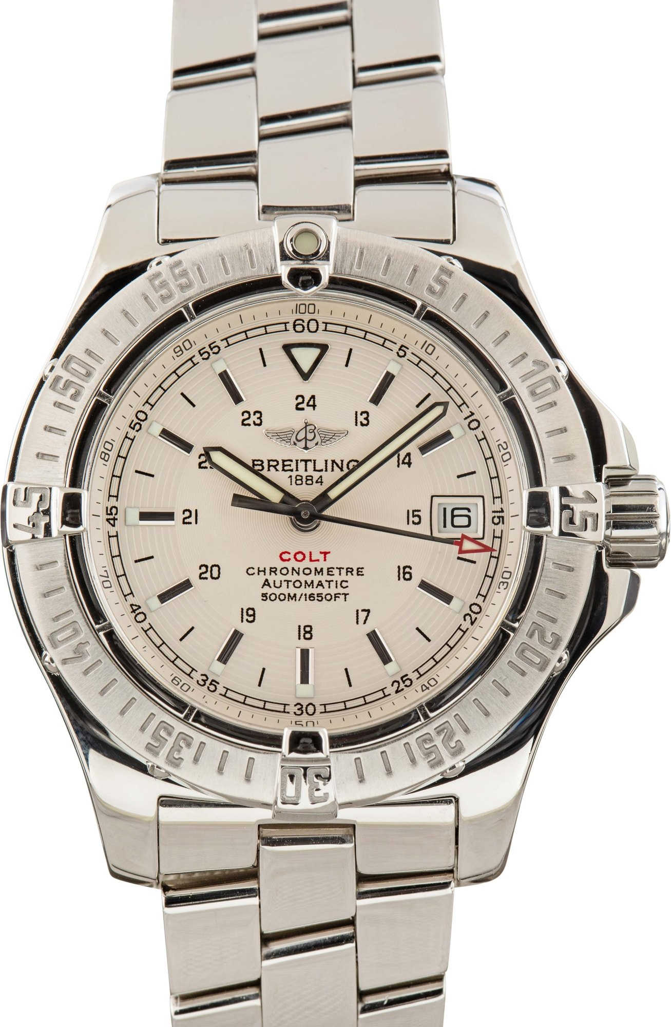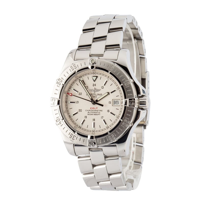 This Breitling Colt ref. A17380 (2005) features a 41mm stainless steel case and bracelet with a unidirectional timing bezel, built for durability and everyday wear. The ivory index dial adds a refined touch to its rugged design, offering clear legibility. Powered by the Breitling Caliber 17 automatic movement, this Colt delivers reliable performance and classic Breitling functionality.