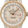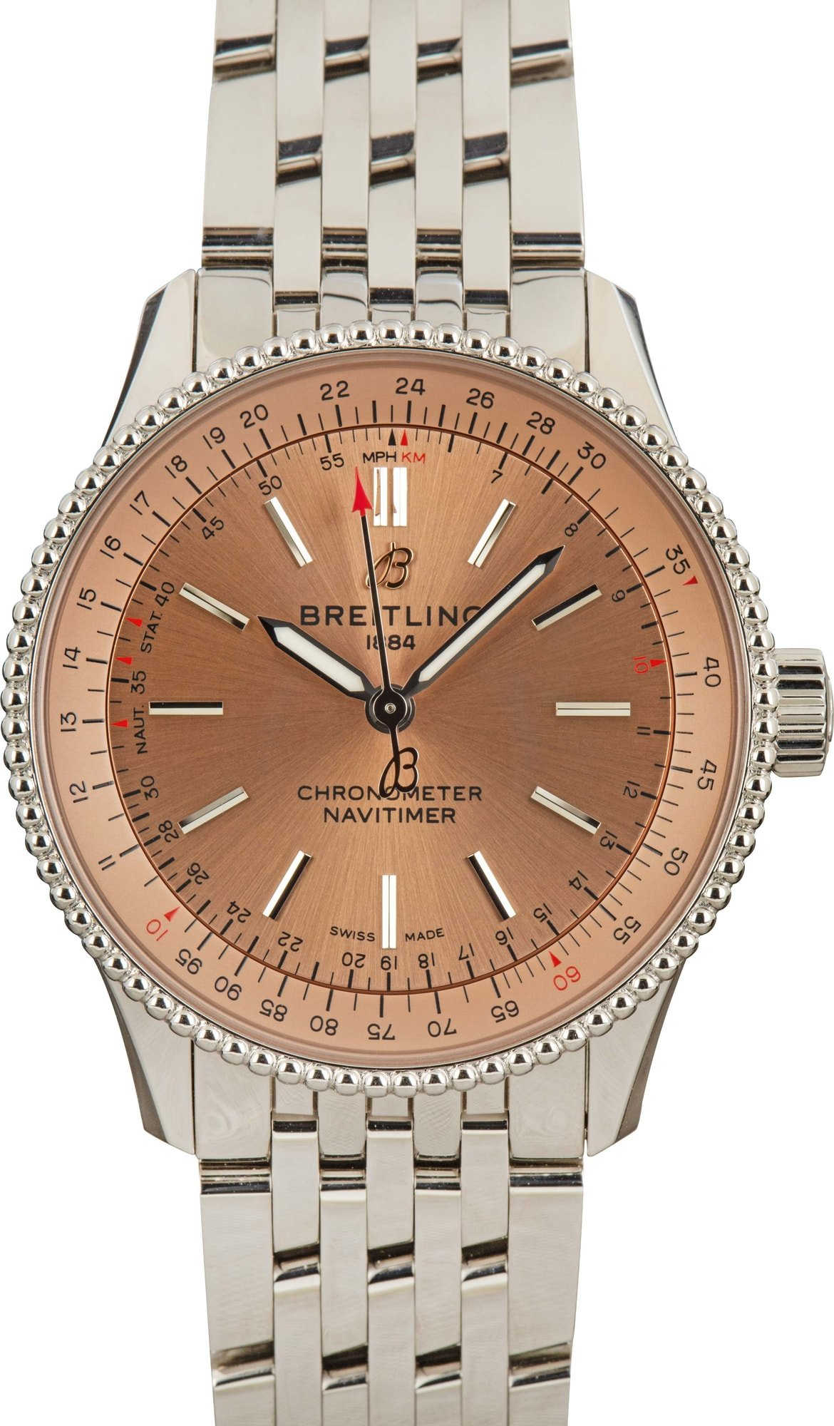 This /unworn Breitling Navitimer Automatic 35 ref. A17395201K1A1 exudes classic sophistication with its stunning 35mm stainless steel case and iconic slide rule bezel. Driven by the Breitling 17 caliber, this self-winding mechanical watch offers precision performance with a 38-hour power reserve and 26 jewels. Its cambered sapphire crystal, glareproofed on both sides, ensures clarity and durability, while the screwed-in caseback and stainless steel bracelet add a polished touch. With a timeless design and legendary functionality, this Navitimer is the perfect companion for those who appreciate heritage and elegance in every detail.