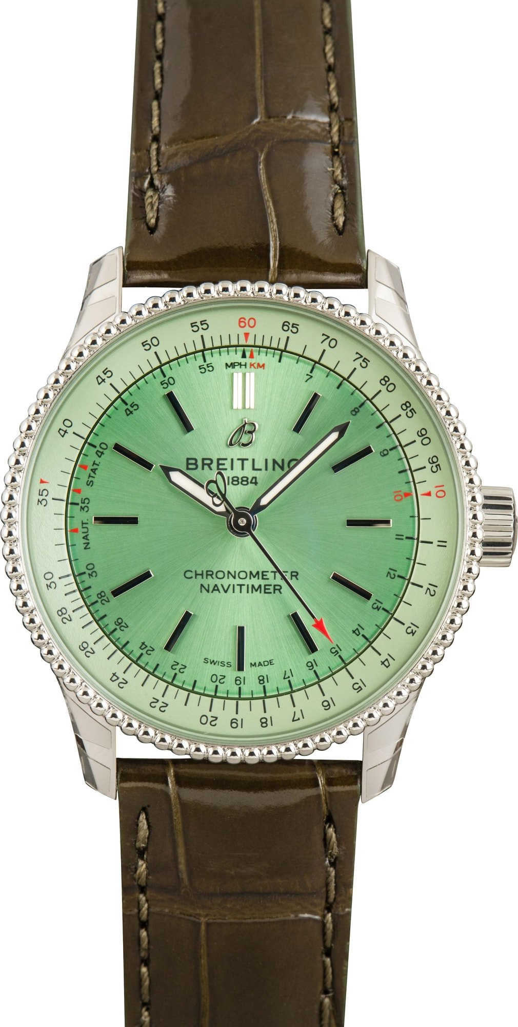 This Breitling Navitimer Automatic 35 ref A17395361L1P2 offers a refined take on an iconic design, tailored for those who appreciate compact elegance. Housed in a 35mm stainless steel case, this timepiece features a bidirectional slide rule bezel, adding a practical yet stylish touch. Powered by the self-winding Breitling Caliber 17 movement with 26 jewels, it delivers reliable performance with a power reserve of approximately 38 hours and a vibration rate of 28,800 v.p.h. A cambered sapphire crystal, glareproofed on both sides, ensures excellent readability, while the screwed-in caseback provides water resistance up to 3 bars. The striking green alligator leather strap with a stainless steel folding clasp completes the look, offering comfort and sophistication in a lightweight 59.9g package. This Navitimer is where classic functionality meets modern charm.