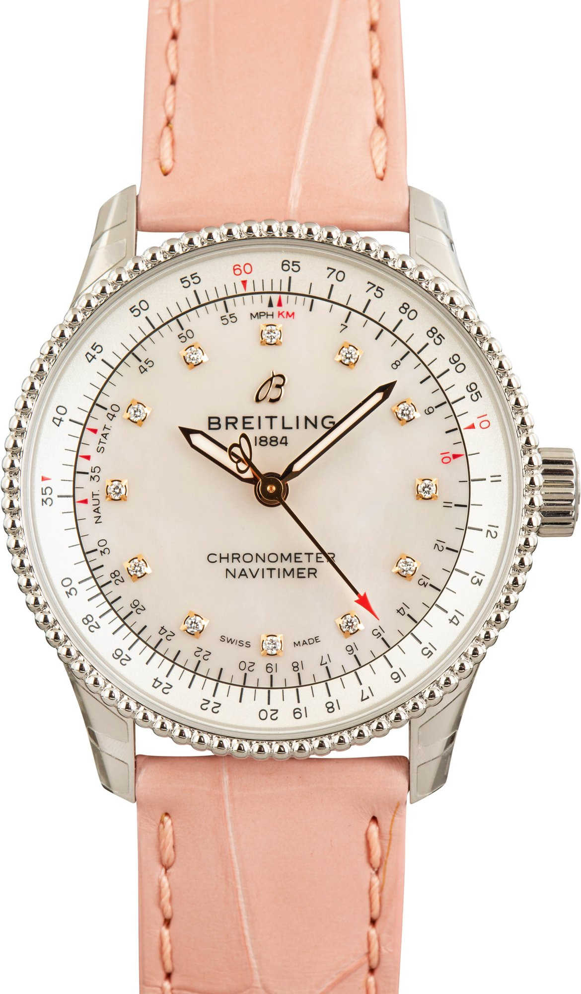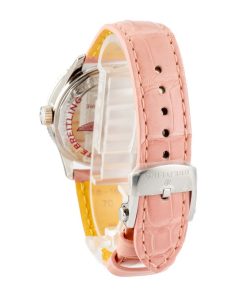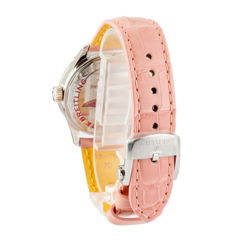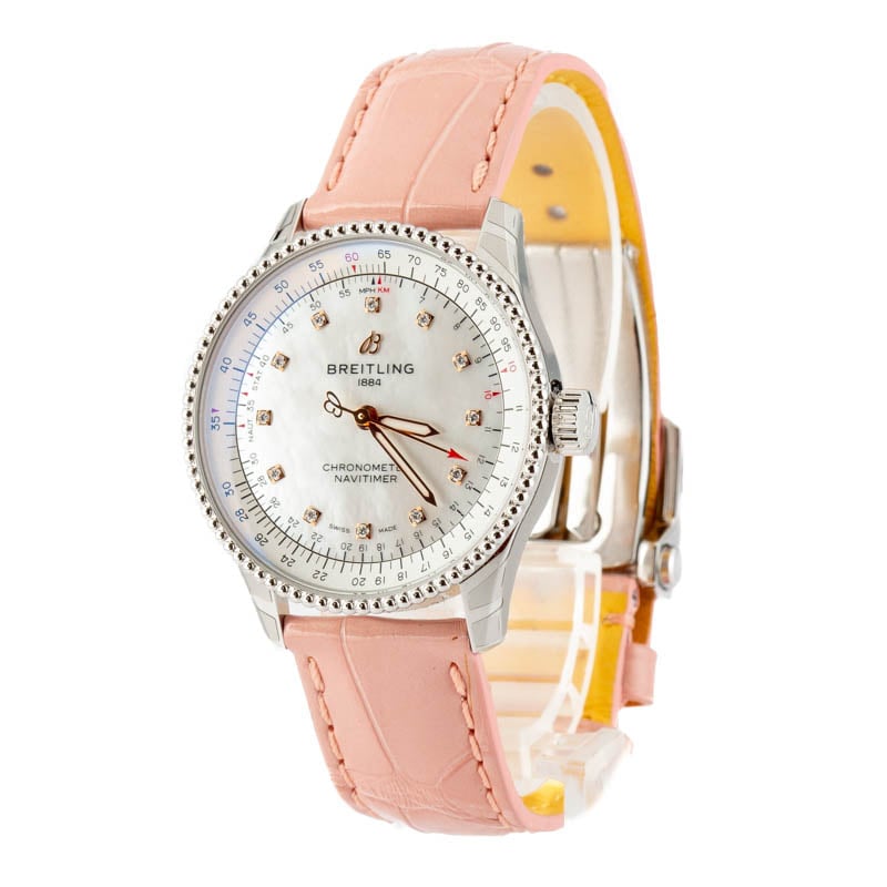 This Breitling Navitimer Automatic 35 ref A17395211A1P4 is a stunning timepiece for the discerning woman. This elegant watch features a 35mm stainless steel case, a sophisticated pink leather strap, and a bidirectional slide rule bezel, perfect for aviation calculations. Powered by the in-house Breitling 17 caliber, it offers reliable performance and a 38-hour power reserve. This watch is in /unworn condition and presents a rare opportunity to acquire a classic Breitling at an attractive price.
