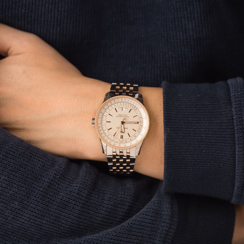 Case Material: Steel and Rose Gold Crystal: Sapphire Size: 41MM Bezel: 18k Rose Gold Slide Rule Caseback: Solid Dial: Silver w/ Index hour markers, Luminous hands & Luminous lume