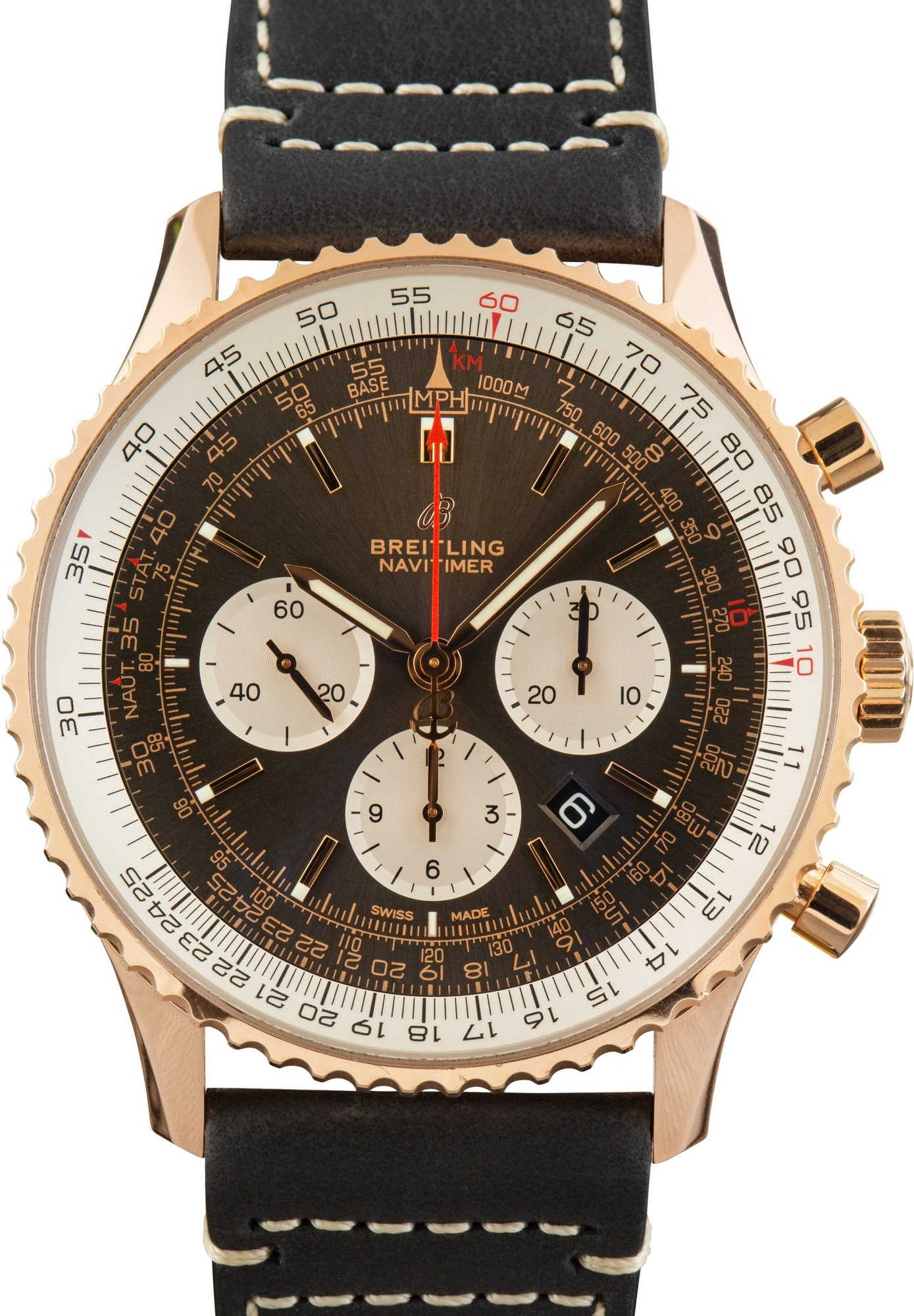 This Breitling Navitimer 46 B01 ref. RB0127121F1P1 (2018) exudes classic aviation heritage and refined luxury. Crafted from 18k red gold, the 46mm case features a signature slide rule bezel and a striking slate dial accented by three silver subdials and a date display at 4:30. Powered by the in-house Breitling Caliber B01 movement, it delivers chronograph precision and a 70-hour power reserve. Completed with a black leather strap, this Navitimer blends timeless design with exceptional craftsmanship.