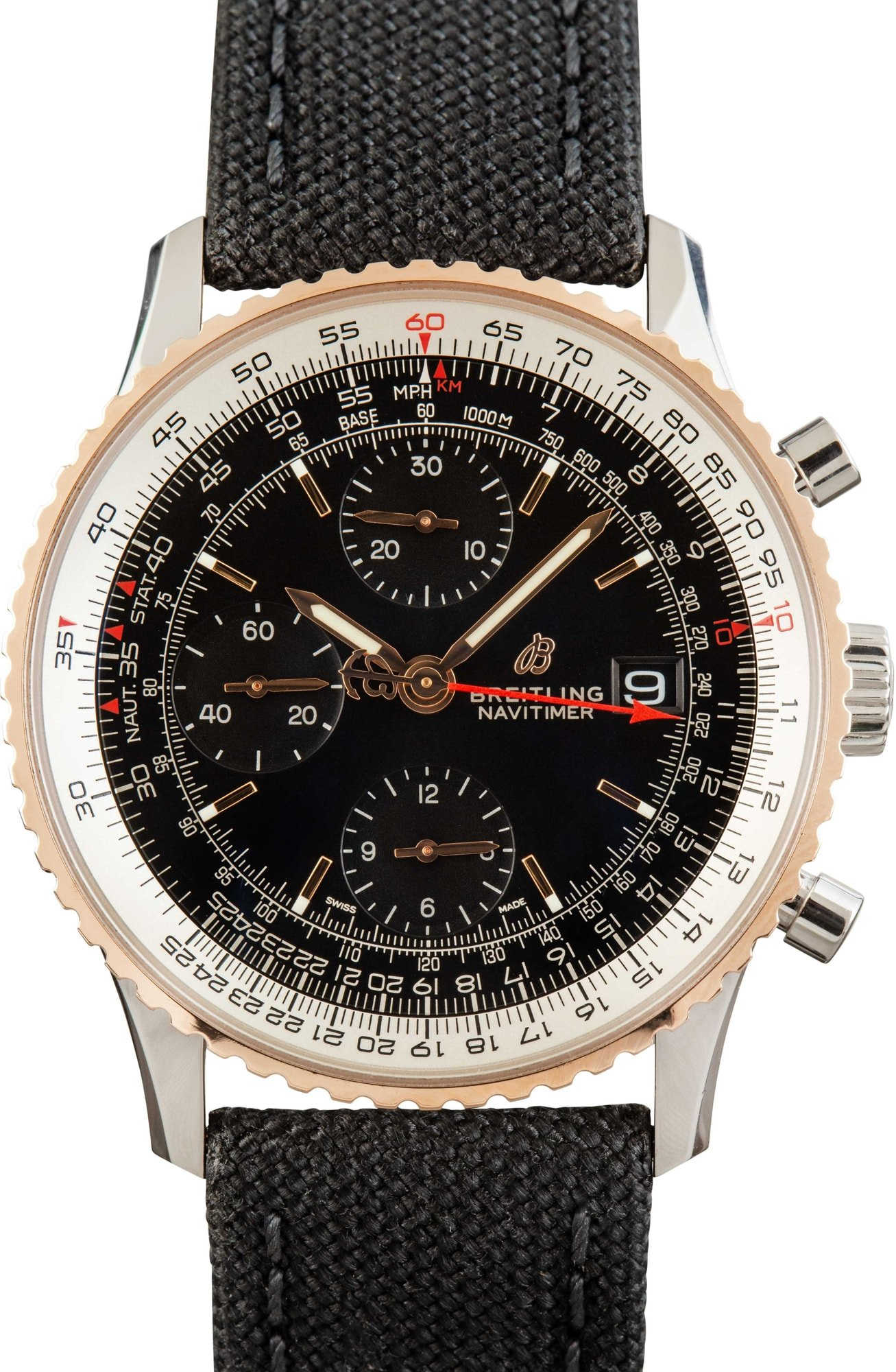 This Breitling Navitimer ref U13324211B1X1 (2018) offers a refined take on a pilot’s classic, featuring a 41mm stainless steel case paired with an 18k red gold slide rule bezel. This black dial is detailed with luminous index hour markers, three subdials, and a date window at 3 o’clock for balanced functionality. Powered by the Breitling 13 automatic chronograph movement, it delivers reliable performance. Finished with a rugged black fabric strap, this Navitimer combines aviation heritage with modern sophistication.