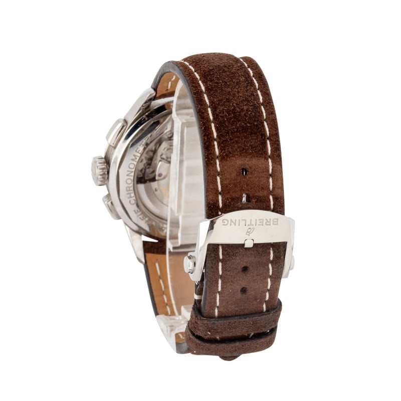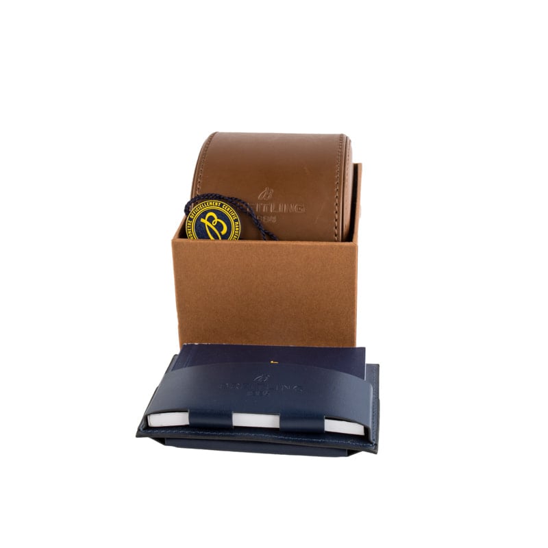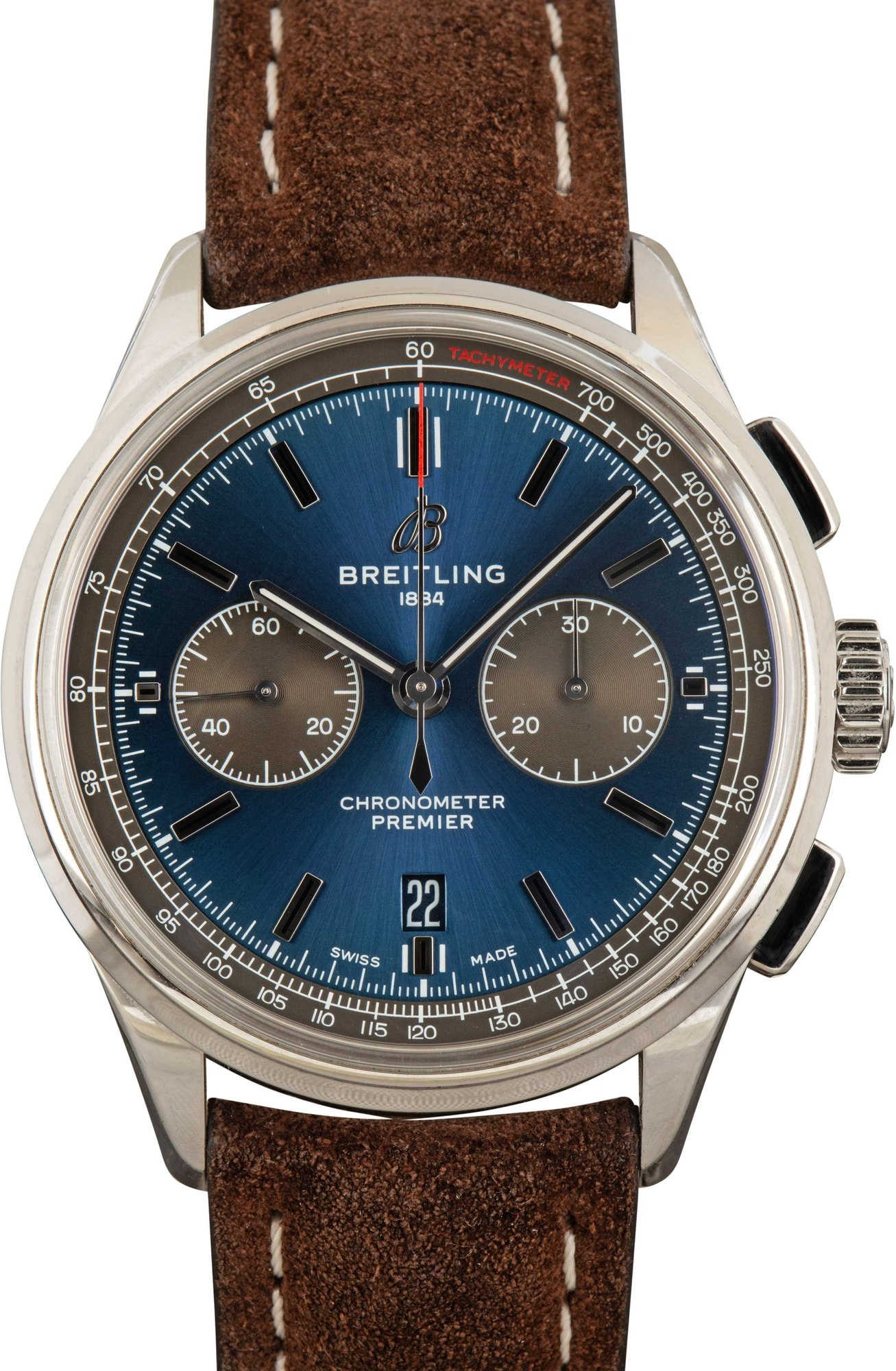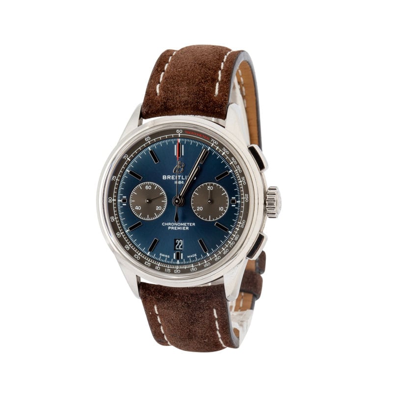 This Breitling Premier B01 Chronograph ref AB0118 (2018) features a 42mm stainless steel case paired with a brown leather strap and a vibrant blue dial. Powered by an automatic movement, it showcases Breitling’s signature precision and craftsmanship, combining elegance with reliable performance.