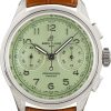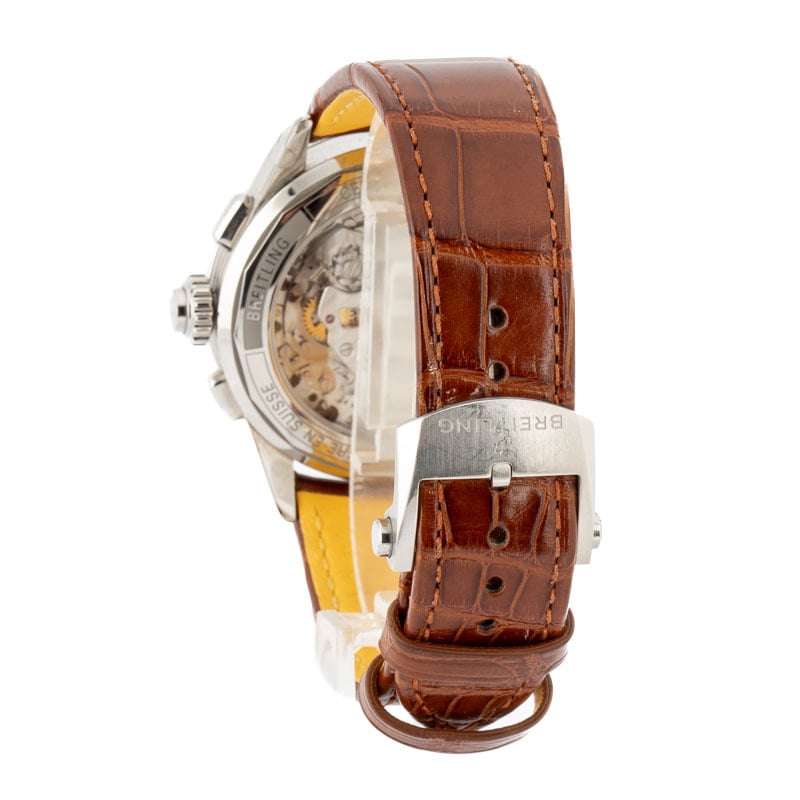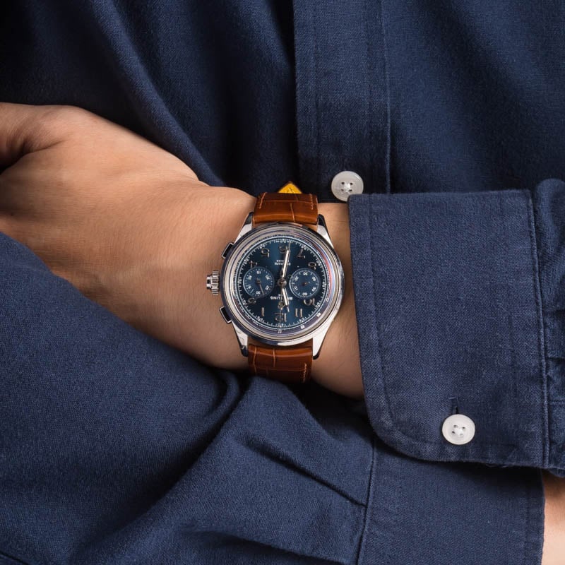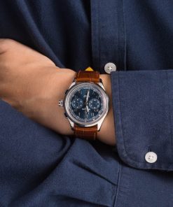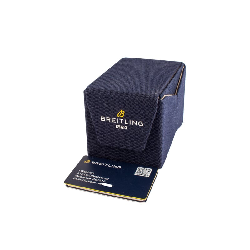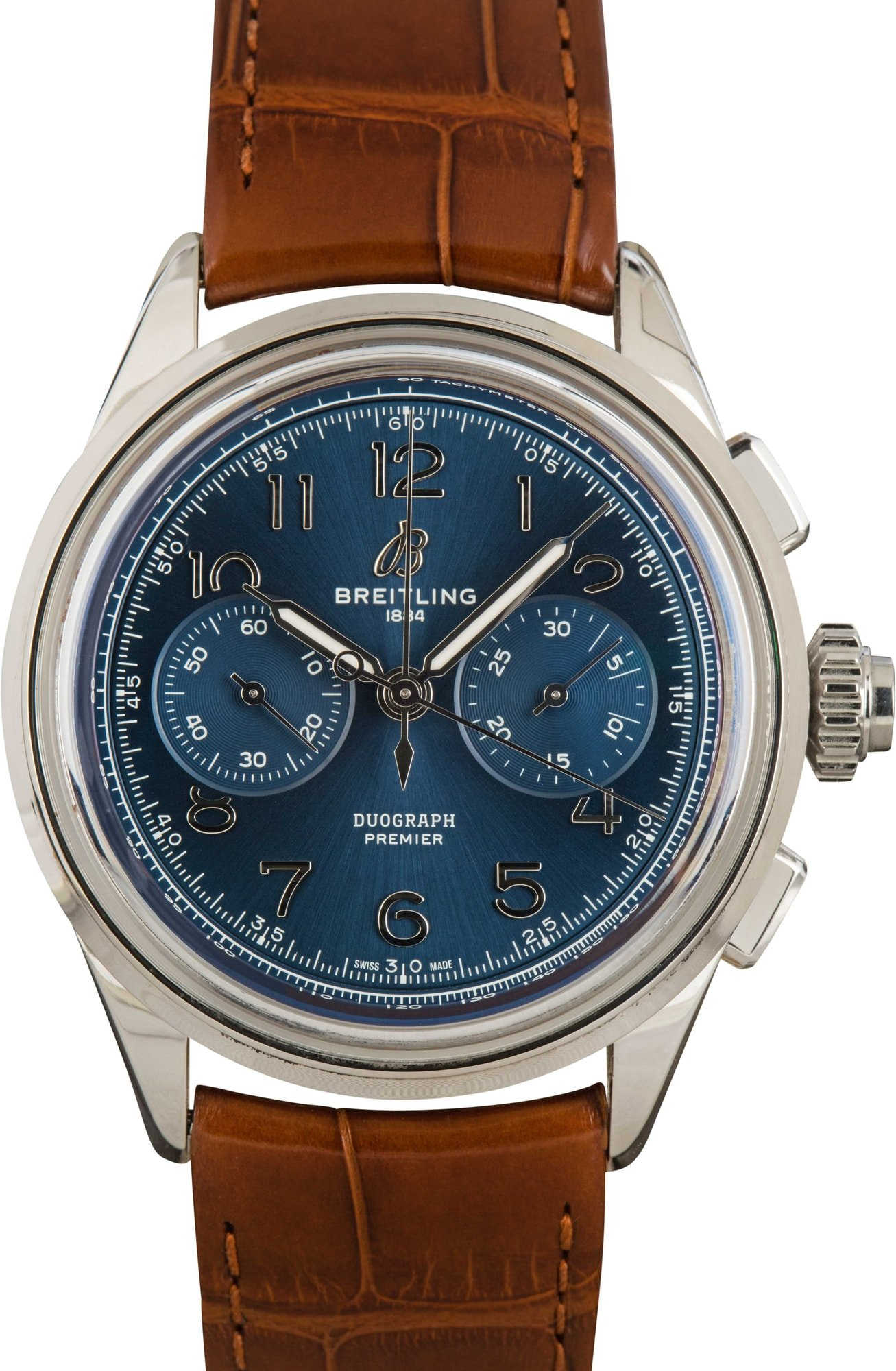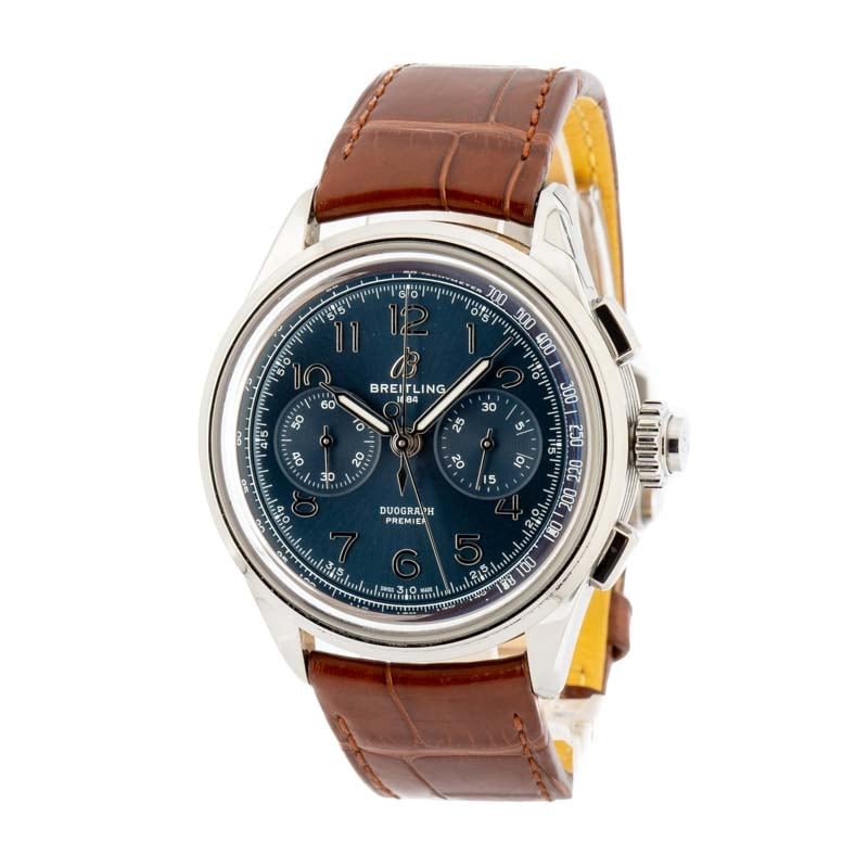 This Breitling Premier B15 Duograph 42 ref. AB1510171C1P1, released in 2022, showcases a 42mm stainless steel case with a smooth bezel. The blue Arabic dial provides a classic yet striking contrast, matched with a brown leather strap for a refined look. Equipped with Breitling’s caliber B15, this timepiece combines elegance with the technical precision Breitling is known for.