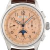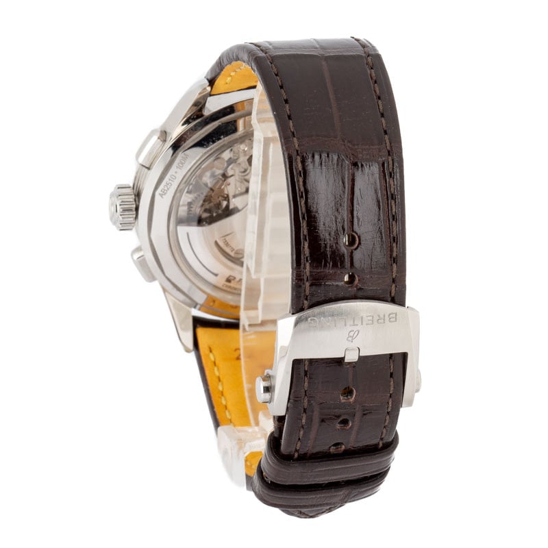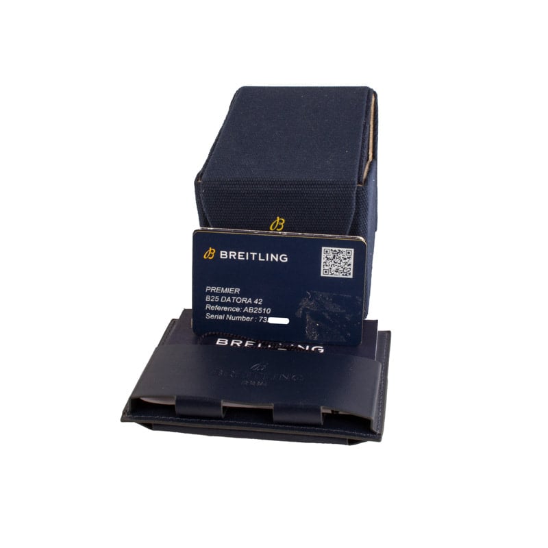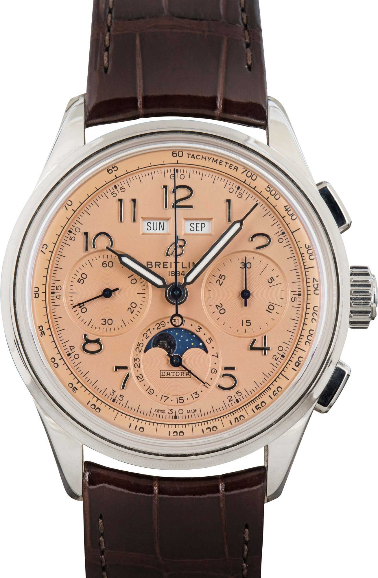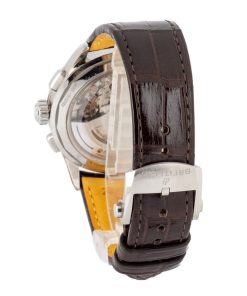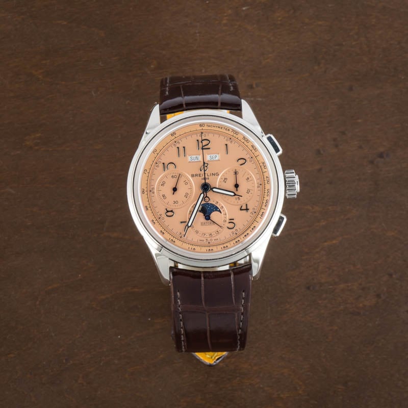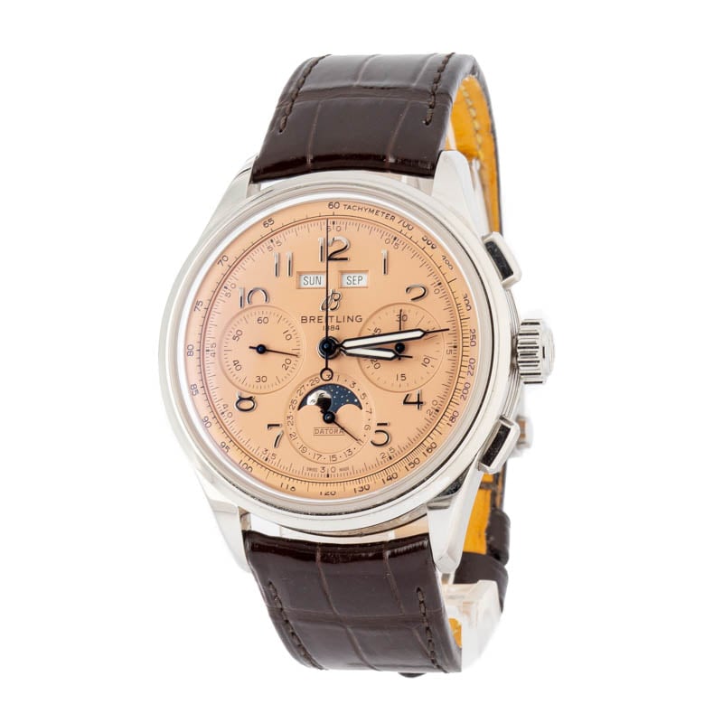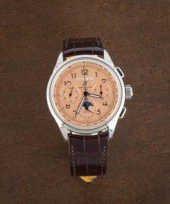 This Copper dial Breitling Premier B25 Datora 42 offers the perfect blend of classic elegance and modern functionality. Featuring a self-winding movement with a moon-phase complication, chronograph, and a calendar display, this timepiece exudes sophistication. The 42mm stainless steel case, paired with a luxurious brown leather strap, gives it a refined, timeless appeal. With its durable sapphire crystal, water resistance up to 100 meters, and 48-hour power reserve, this watch is as practical as it is stylish. Don’t miss the opportunity to own this versatile and high-quality Breitling.