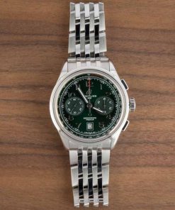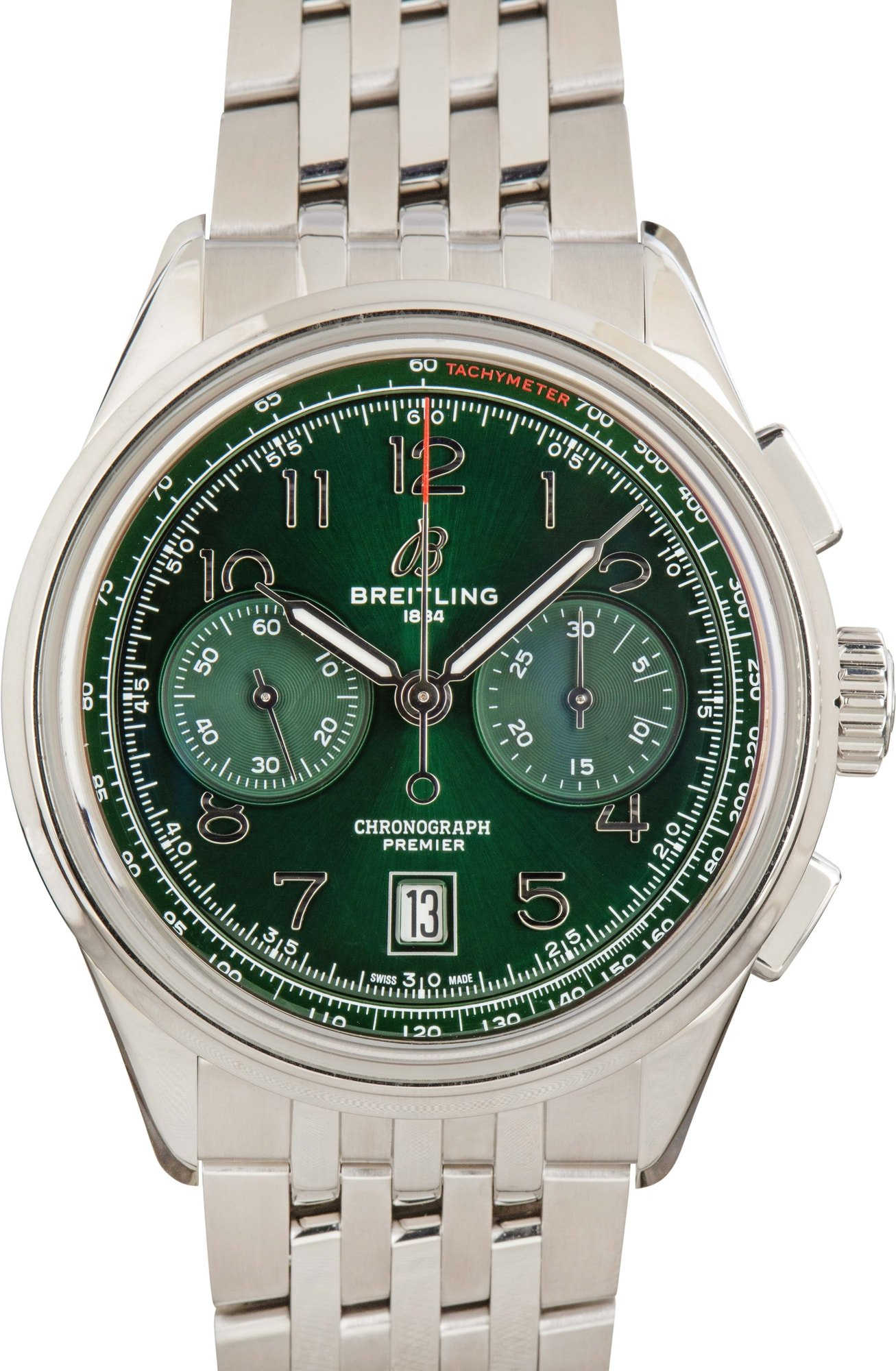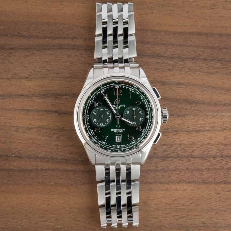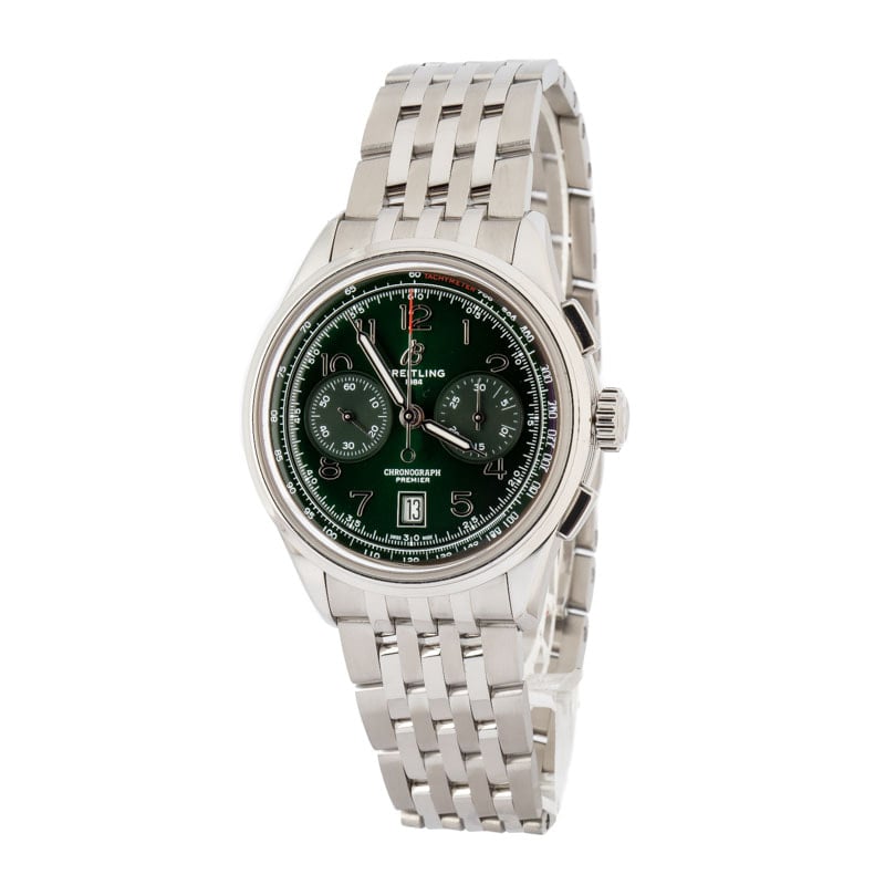 This Breitling Premier B01 Chronograph 42 ref. AB0145371L1A1 (2024) features a 42mm stainless steel case and bracelet with a smooth bezel, blending modern refinement with classic chronograph styling. The striking green Arabic dial adds a contemporary touch, complemented by contrasting sub-dials for optimal legibility. Powered by the in-house Breitling Caliber B01, this timepiece delivers exceptional precision, performance, and timeless sophistication.