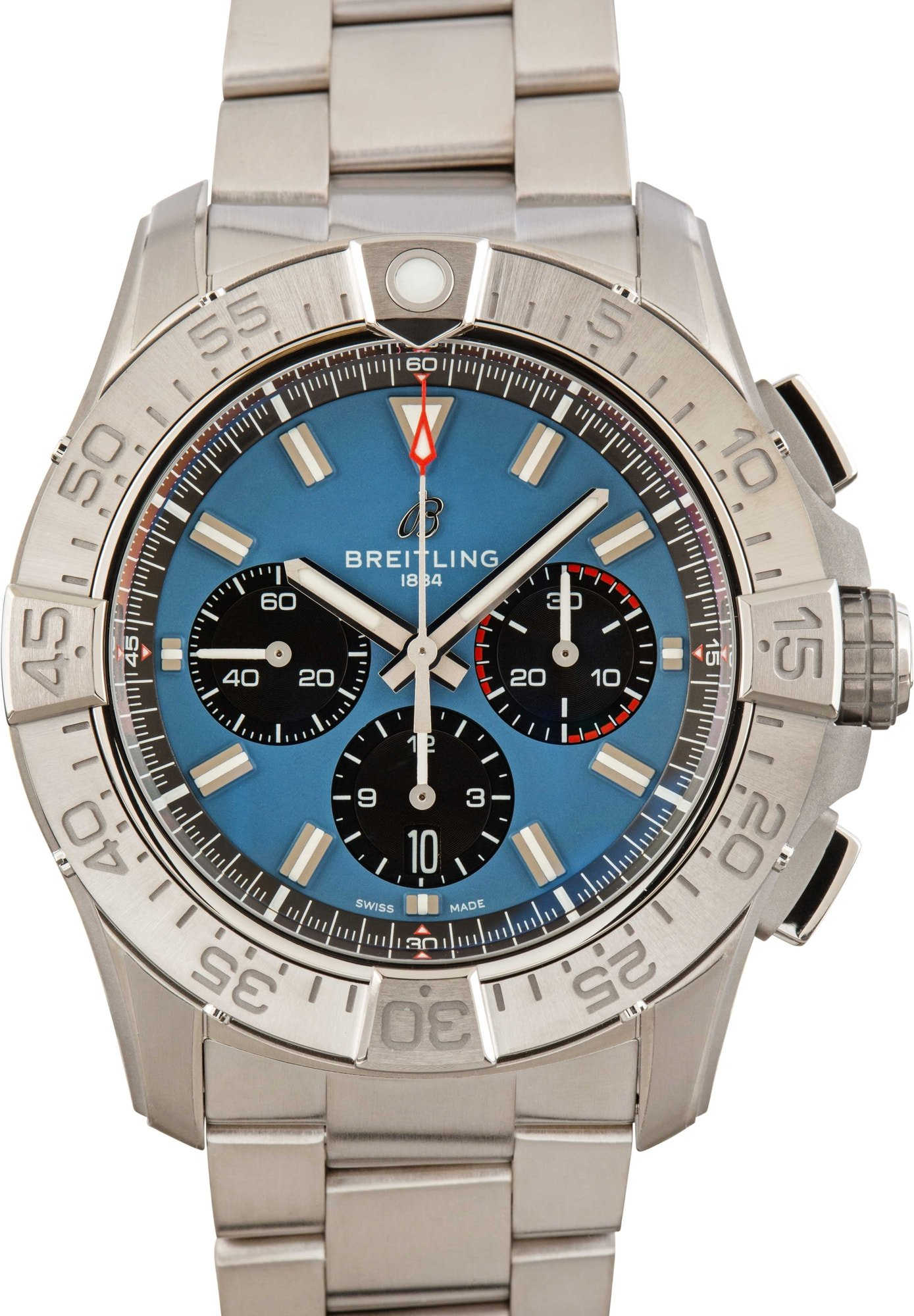 This /unworn Breitling Super Avenger B01 Chronograph 46 ref. EB0148101C1E1 (2024) is a commanding timepiece built for those who demand power and precision. Crafted from lightweight yet durable titanium, its 46mm case houses a bold blue dial with a chronograph function measuring 1/4th second, 30 minutes, and 12 hours. The Breitling 01 self-winding mechanical movement ensures exceptional accuracy with a 70-hour power reserve. A unidirectional ratcheted bezel, screw-locked crown, and 300-meter water resistance make it a formidable tool for extreme conditions. Finished with a titanium bracelet, this Super Avenger is the ultimate blend of strength, reliability, and modern aviation-inspired design.