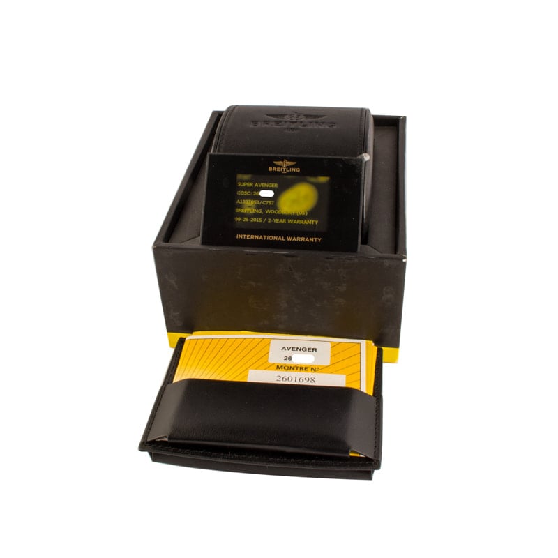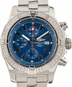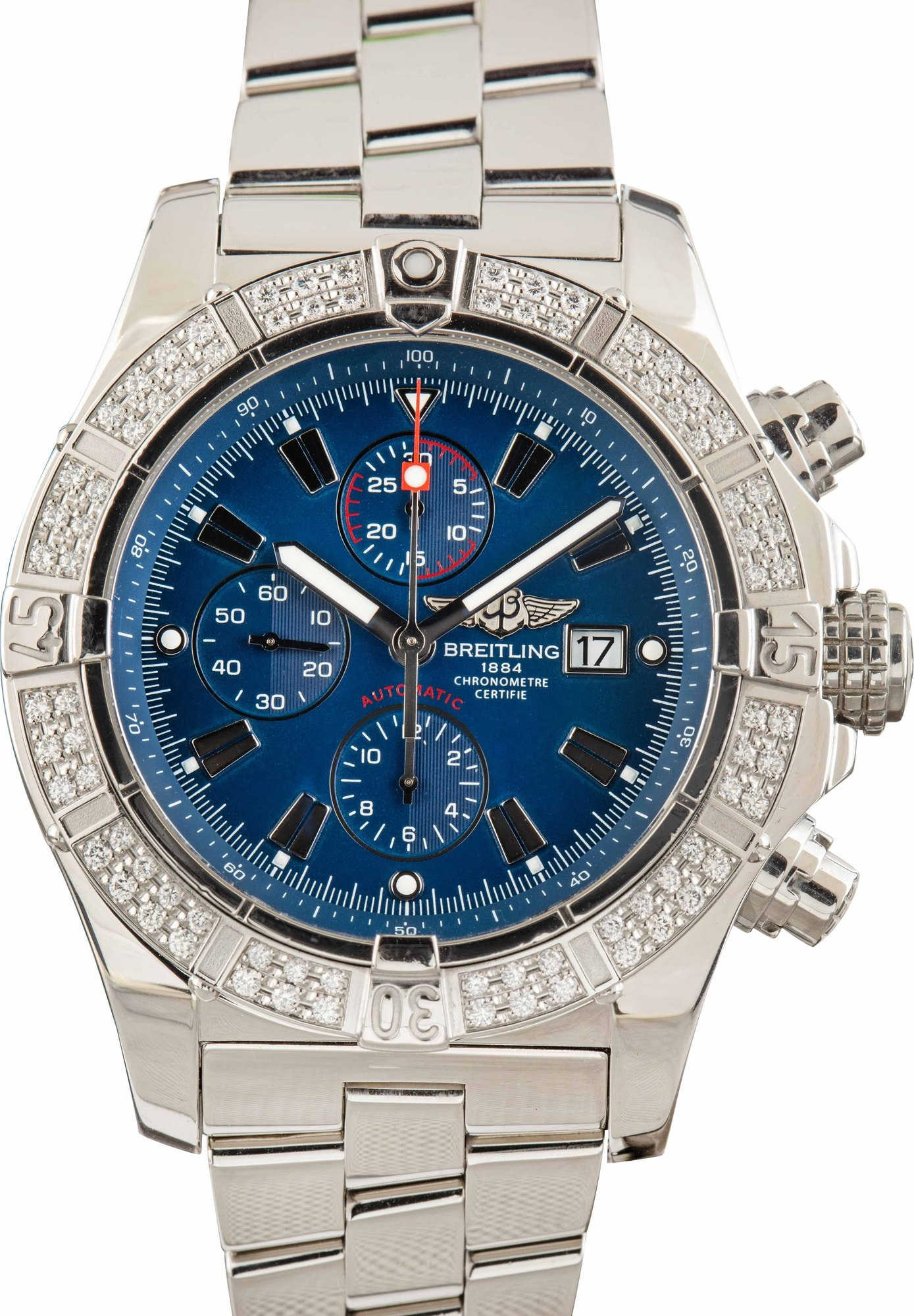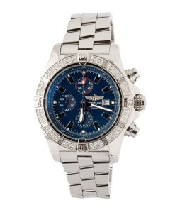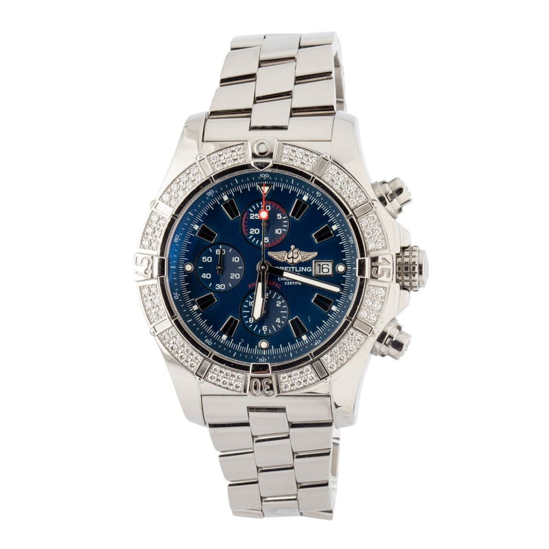 This Breitling Super Avenger ref. A1337053/C757 (2011) features a commanding 48mm stainless steel case and bracelet with a diamond-set bezel, combining bold design with a touch of luxury. The blue dial includes three chronograph subdials and a date display at 3 o’clock for balanced functionality. Powered by the Breitling Caliber 13 automatic movement, this Super Avenger delivers precise chronograph performance and robust reliability.