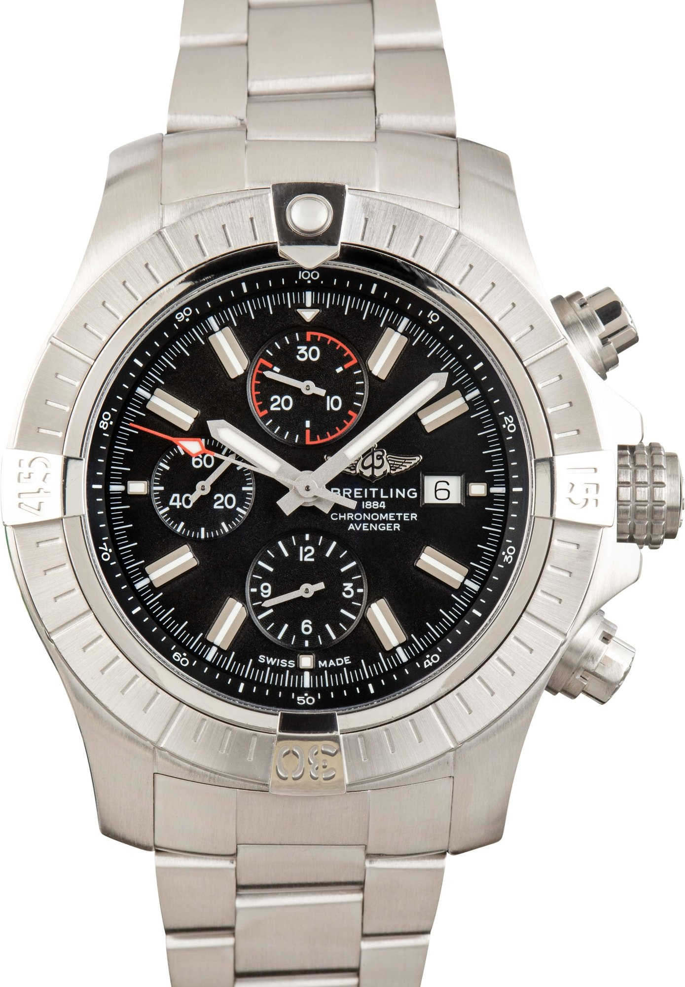 This Breitling Super Avenger stands out with its bold black dial, chronograph functionality, and robust timing bezel, delivering a powerful and commanding presence. It seamlessly combines rugged durability with high-performance capability, making it an ideal companion for any adventure.