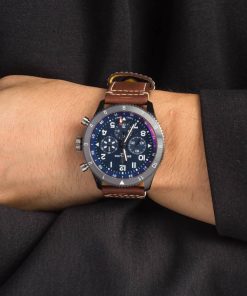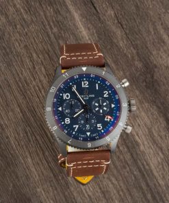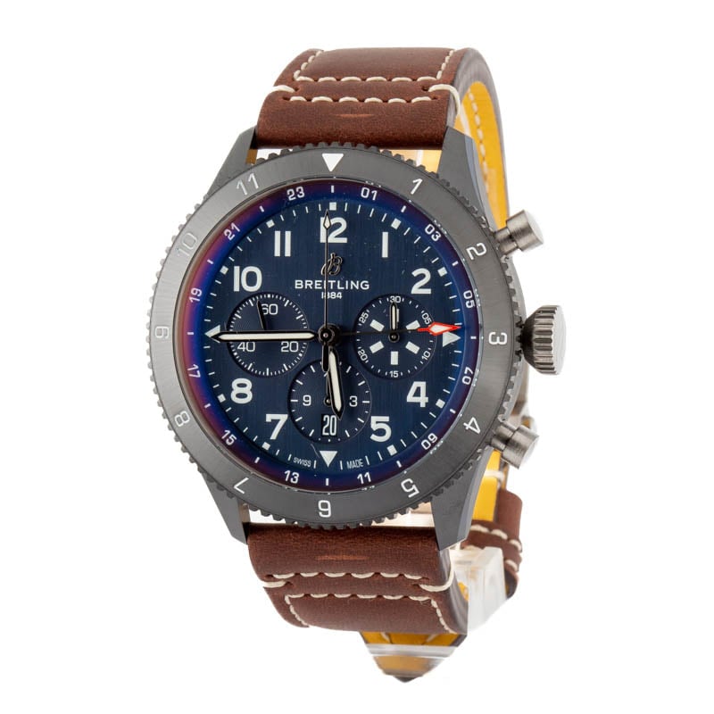 This /unworn Breitling Super AVI B04 Chronograph GMT 46 Tribute to Vought F4U Corsair ref. SB04452A1C1X2 is a striking homage to the legendary naval aircraft. Housed in a bold 46mm black ceramic case, this aviation-inspired timepiece features a rich blue dial with matching sub-dials, a 24-hour GMT hand, and chronograph functions powered by the in-house Breitling B04 movement. With a 70-hour power reserve and 47 jewels, it delivers precision and endurance in a lightweight, modern package. A cambered sapphire crystal glareproofed on both sides enhances visibility, while the transparent sapphire caseback offers a glimpse of the movement. Paired with a brown leather strap and titanium folding clasp, this Super AVI blends rugged design with refined craftsmanship, ready for adventure in the sky or on the ground.