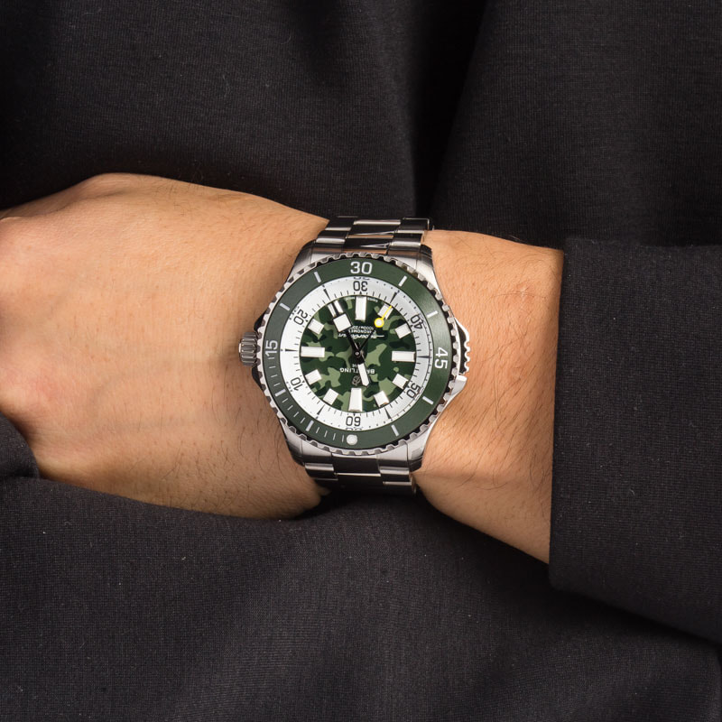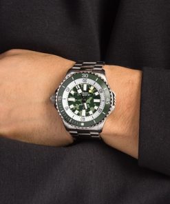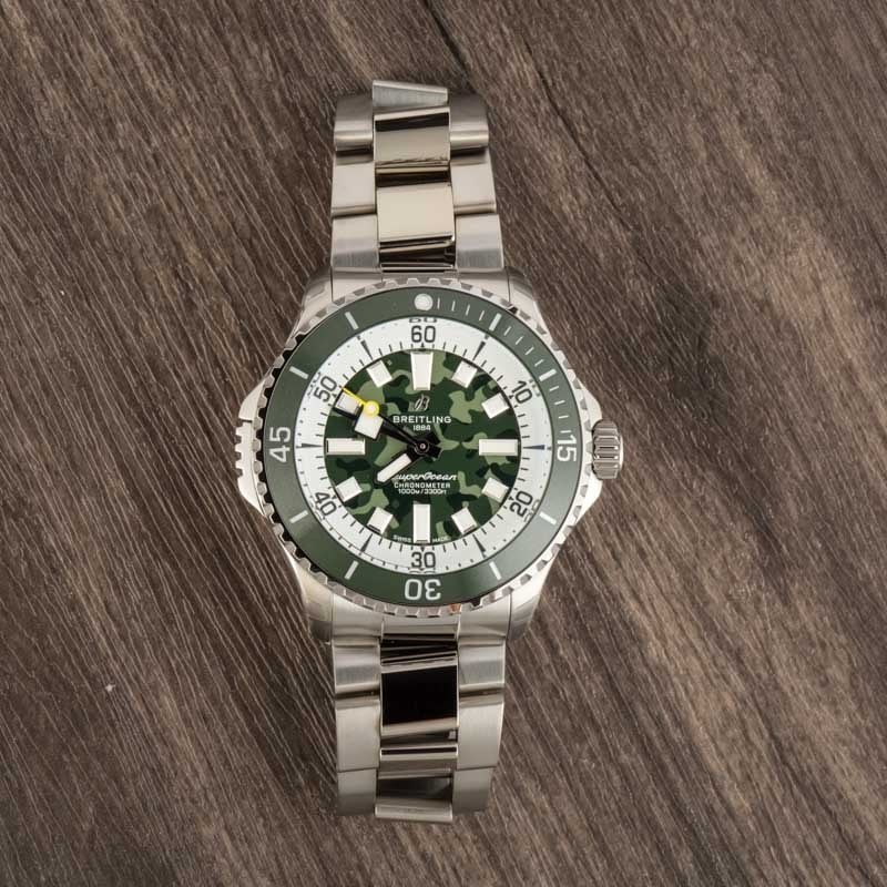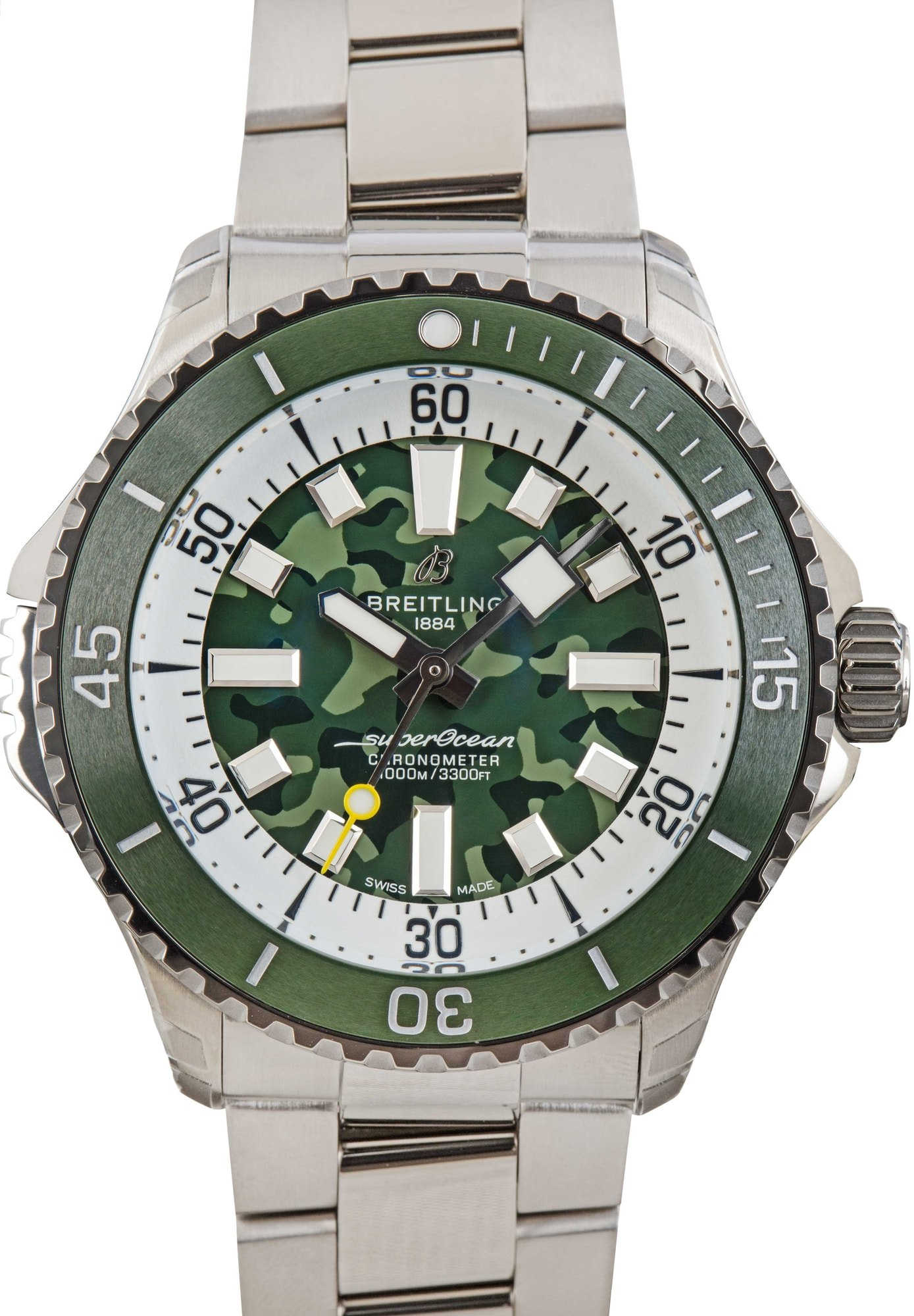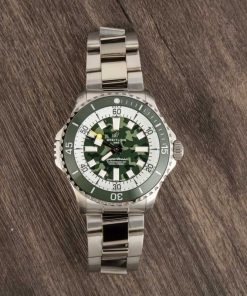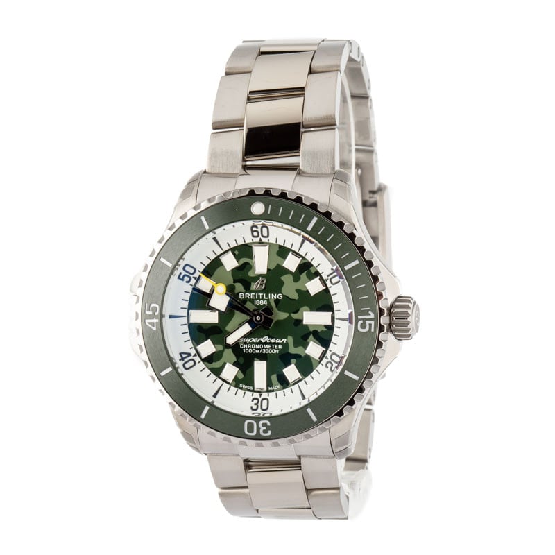 This Breitling Superocean Automatic 46 Super Diver is built for the extremes, featuring a lightweight yet ultra-durable titanium case and an impressive 1,000-meter water resistance. Powered by the self-winding Breitling Caliber 10 with a 42-hour power reserve, this unworn dive watch delivers reliable performance in the harshest environments. The green dial adds a bold pop of color, while the glareproofed sapphire crystal ensures clarity at any depth. Finished with a matching titanium bracelet, this professional-grade tool watch is as tough as it is striking.