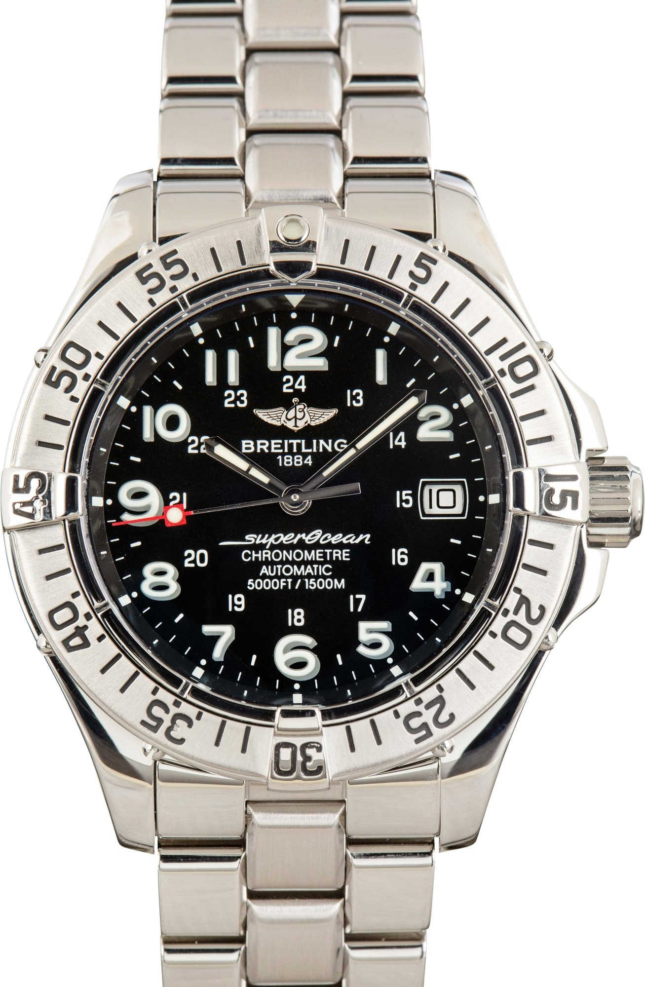 This Breitling Superocean ref. A1736011/B639 (2004) features a 42mm stainless steel case and bracelet with a unidirectional timing bezel, designed for professional dive use. The black dial is accented with Arabic numerals for clear readability under any conditions. Powered by the Breitling Caliber 17 automatic movement, this Superocean offers reliable precision, robust performance, and classic Breitling styling.