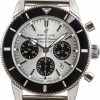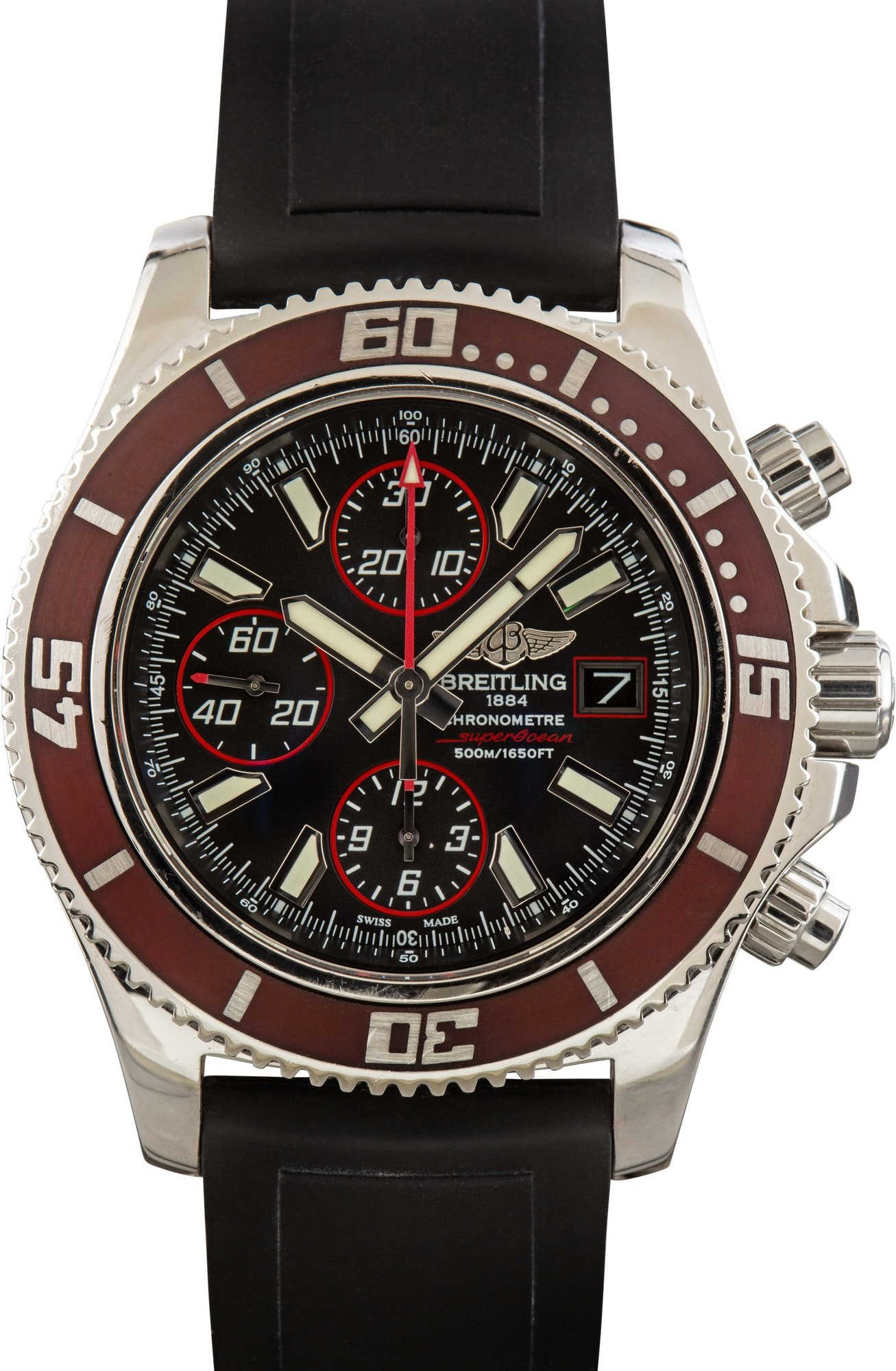 This Breitling Superocean Chrono II ref A13341X9/BA81 (2012) features a 44mm stainless steel case paired with a striking red timing bezel, adding a bold touch to its dive-ready design. The black index dial is equipped with three subdials and a date window at 3 o’clock, ensuring optimal readability. Powered by the reliable Breitling Caliber 13 automatic movement, this chronograph delivers precision and durability. Mounted on a black rubber strap, it seamlessly blends sportiness with functionality, making it a robust companion for underwater and everyday adventures.