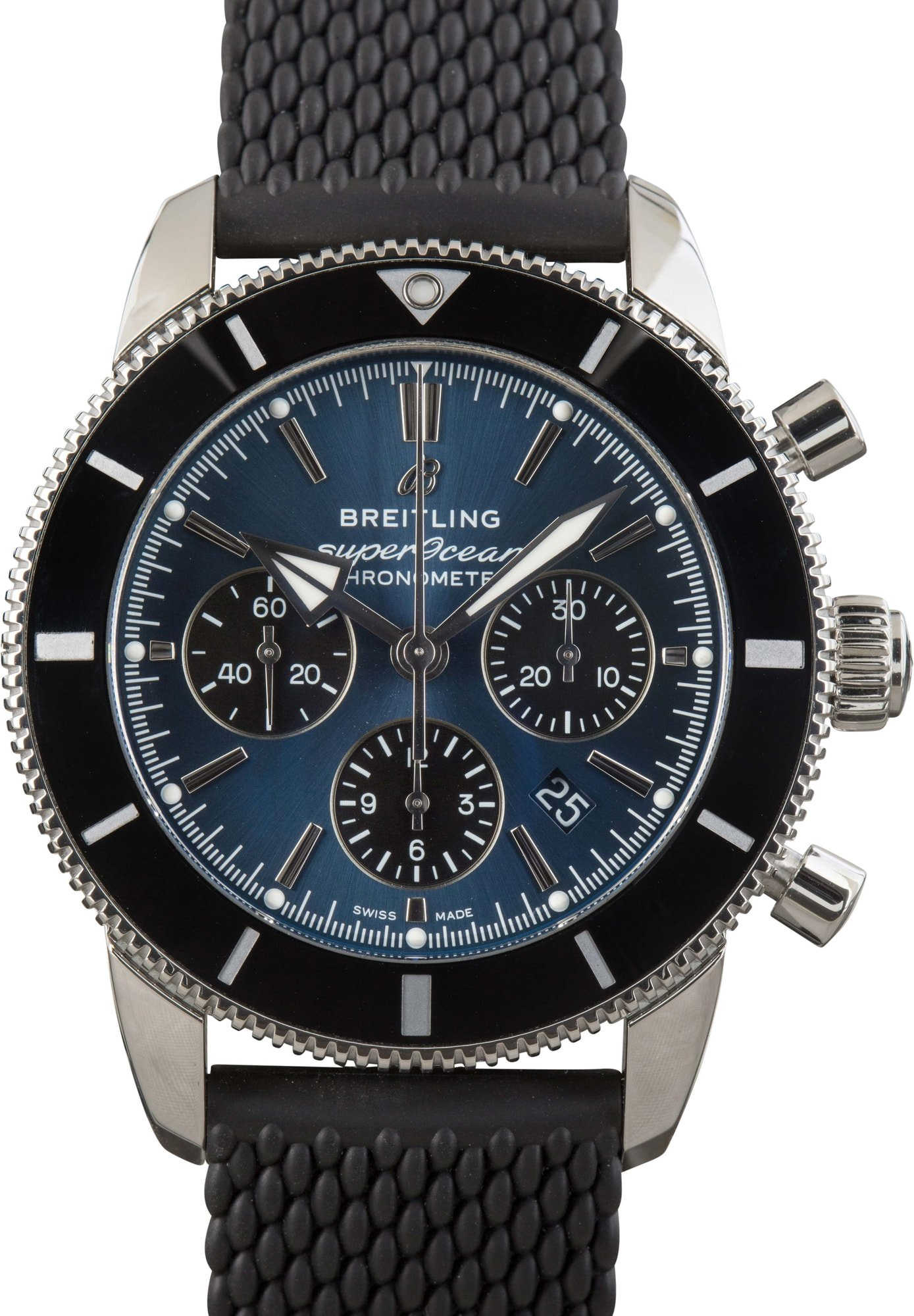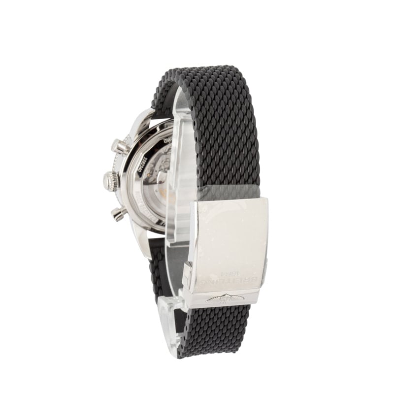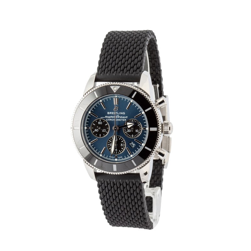 This Breitling Superocean Heritage B01 Chronograph 44 ref. AB0162121C1S1 offers a perfect balance of luxury, performance, and diving capability. Its 44 mm stainless steel case features a unidirectional ratcheted bezel, screw-locked crown, and cambered sapphire crystal with anti-glare coating, delivering water resistance up to 200 m. Powered by Breitling’s in-house Caliber B01 automatic movement with a 70-hour power reserve, it provides precise 1/4‑second, 30-minute, and 12-hour chronograph functions. Finished with a bold black rubber strap and push-button folding clasp, this watch combines Swiss craftsmanship with sporty elegance, ideal for both underwater adventures and everyday wear.