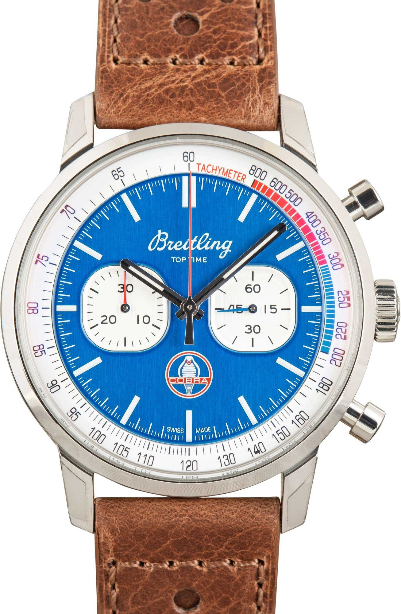 This Breitling Top Time B01 Shelby Cobra ref. A41315A71C1X2 (2021) pays tribute to the legendary Shelby Cobra, capturing the spirit of classic American motorsport. It features a 40mm stainless steel case with a smooth bezel and a striking blue dial accented by two white sub-dials, echoing the Cobra’s iconic racing colors. Paired with a brown leather strap for a vintage-inspired touch, this chronograph is powered by the Breitling Caliber 41, delivering precision and performance worthy of its automotive heritage.