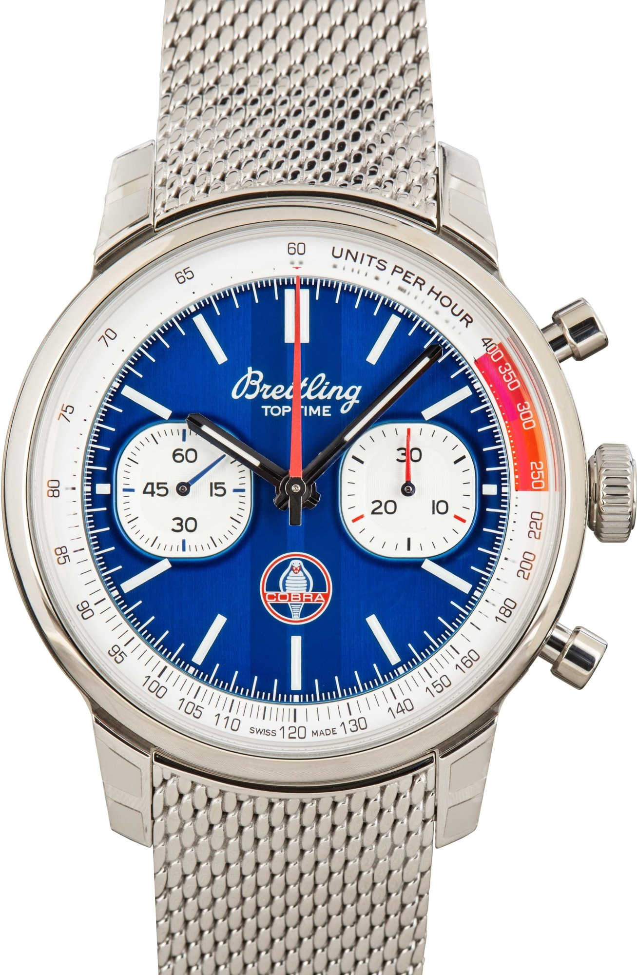 This unworn Breitling Top Time B01 Shelby Cobra captures the spirit of one of the most iconic race cars ever built. From its rich blue dial with contrasting white sub-dials to the classic Cobra logo, every detail evokes speed and vintage American muscle. Powered by the in-house B01 movement with a 70-hour power reserve, this 41mm stainless steel chronograph is a precision-engineered tribute to the track legend that conquered Le Mans and stole hearts worldwide.