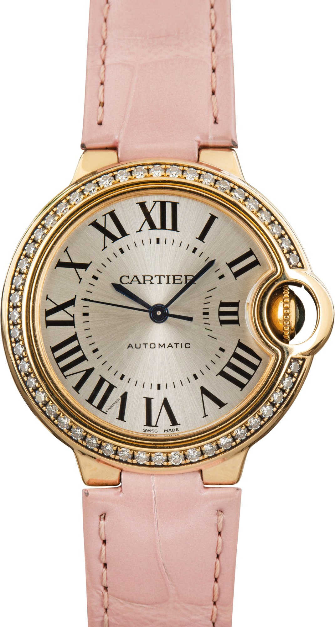 Radiating timeless elegance and refined glamour, this Cartier Ballon Bleu WJBB0040 is a striking statement piece with its 18k yellow gold case, brilliant diamond-set bezel, and soft pink leather strap. The signature silver opaline dial with Roman numerals and blued steel hands captures Cartier’s iconic style, while the automatic movement ensures lasting performance. A perfect blend of classic design and modern luxury, this watch is made to turn heads.