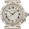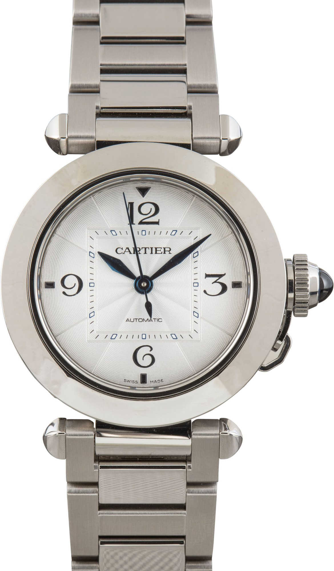 Cartier Pasha WSPA0013 (2024). This 35 mm Pasha de Cartier combines classic elegance with modern versatility. Powered by the mechanical automatic Caliber 1847 MC, it features a steel case with a fluted crown cap and crown set with synthetic spinels, complemented by a silver flinqué dial and blued-steel diamond-shaped hands. The steel bracelet, equipped with Cartier’s “SmartLink” adjustment system, fits up to a 6.5-inch wrist. Case measures 35 mm in diameter and 9.37 mm thick, and the watch is water-resistant to 10 bar (100 meters), ready for everyday wear with refined style.