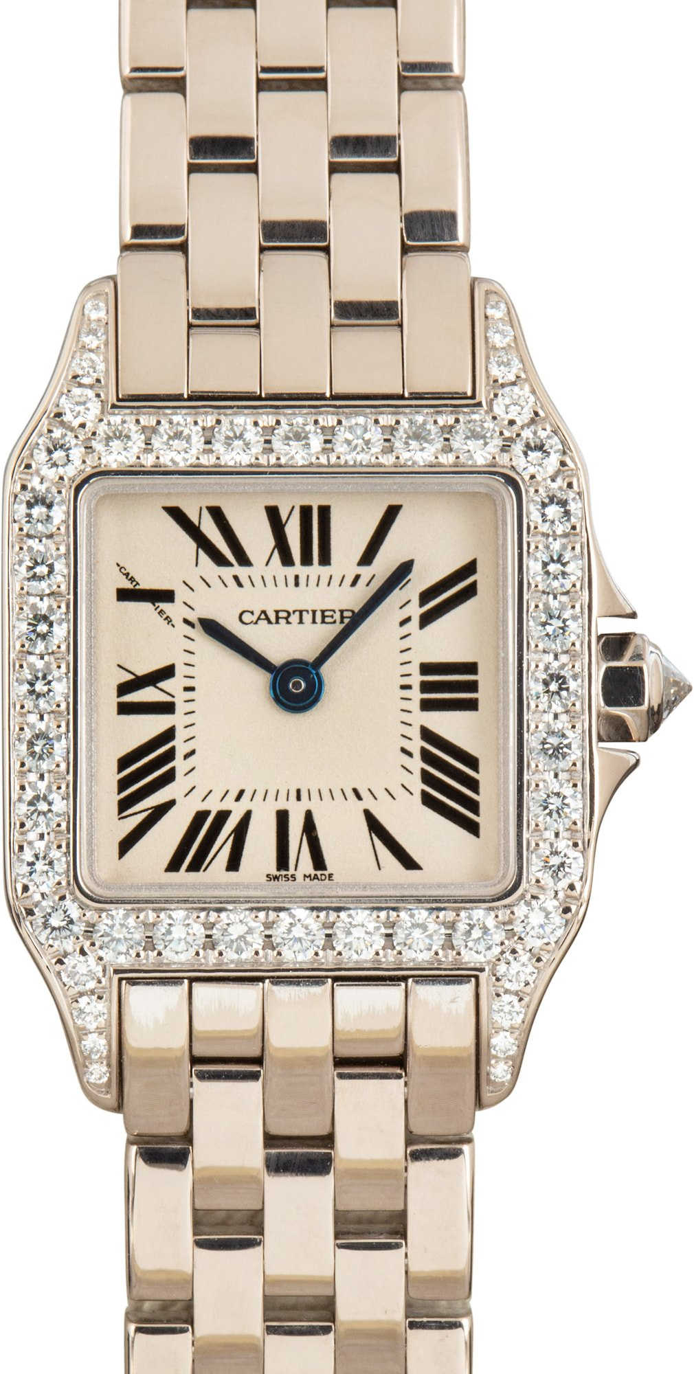 This Cartier Santos Demoiselle ref WF9003Y8 exudes elegance with its delicate yet sophisticated design. Crafted from 18k white gold, the case measures approximately 22mm and is adorned with a diamond-set bezel, adding a refined touch of luxury. The silvered dial features Cartier’s signature Roman numerals and blued-steel hands, embodying timeless style. Powered by a precise quartz movement and protected by a sapphire crystal, this exquisite timepiece is both reliable and effortlessly chic. Paired with an integrated 18k white gold bracelet, the Santos Demoiselle is a perfect statement piece for those who appreciate understated luxury. Water-resistant up to 30 meters.