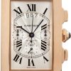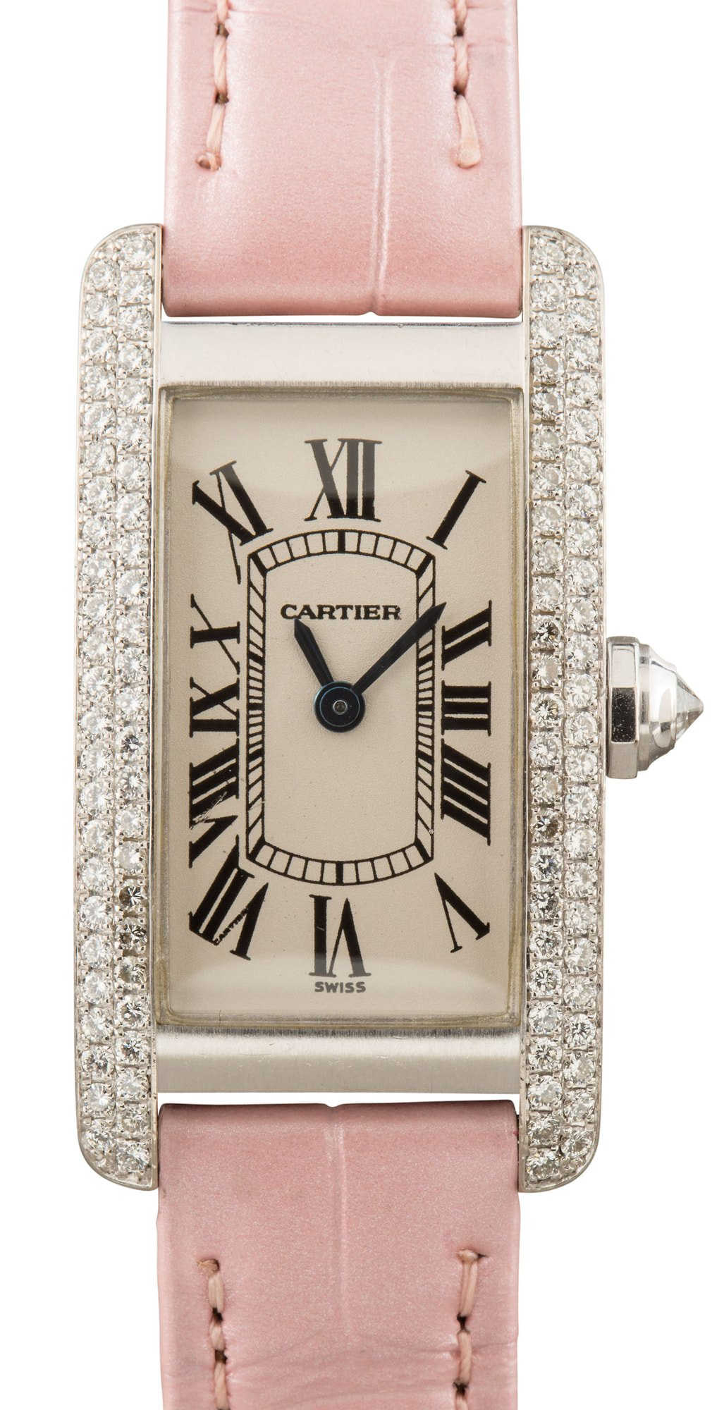 This Cartier Tank Americaine ref. WB701851 is a symbol of elegance and refinement. Its 18k white gold case, measuring 19.0 x 35.0 mm, is adorned with two rows of diamonds on the sides. The silver guilloché dial features black Roman numerals and sword-shaped blue steel hands, while the quartz movement ensures reliable timekeeping. A secret Cartier signature at the “X” adds a touch of exclusive charm. This timepiece is a perfect blend of classic design and luxury.