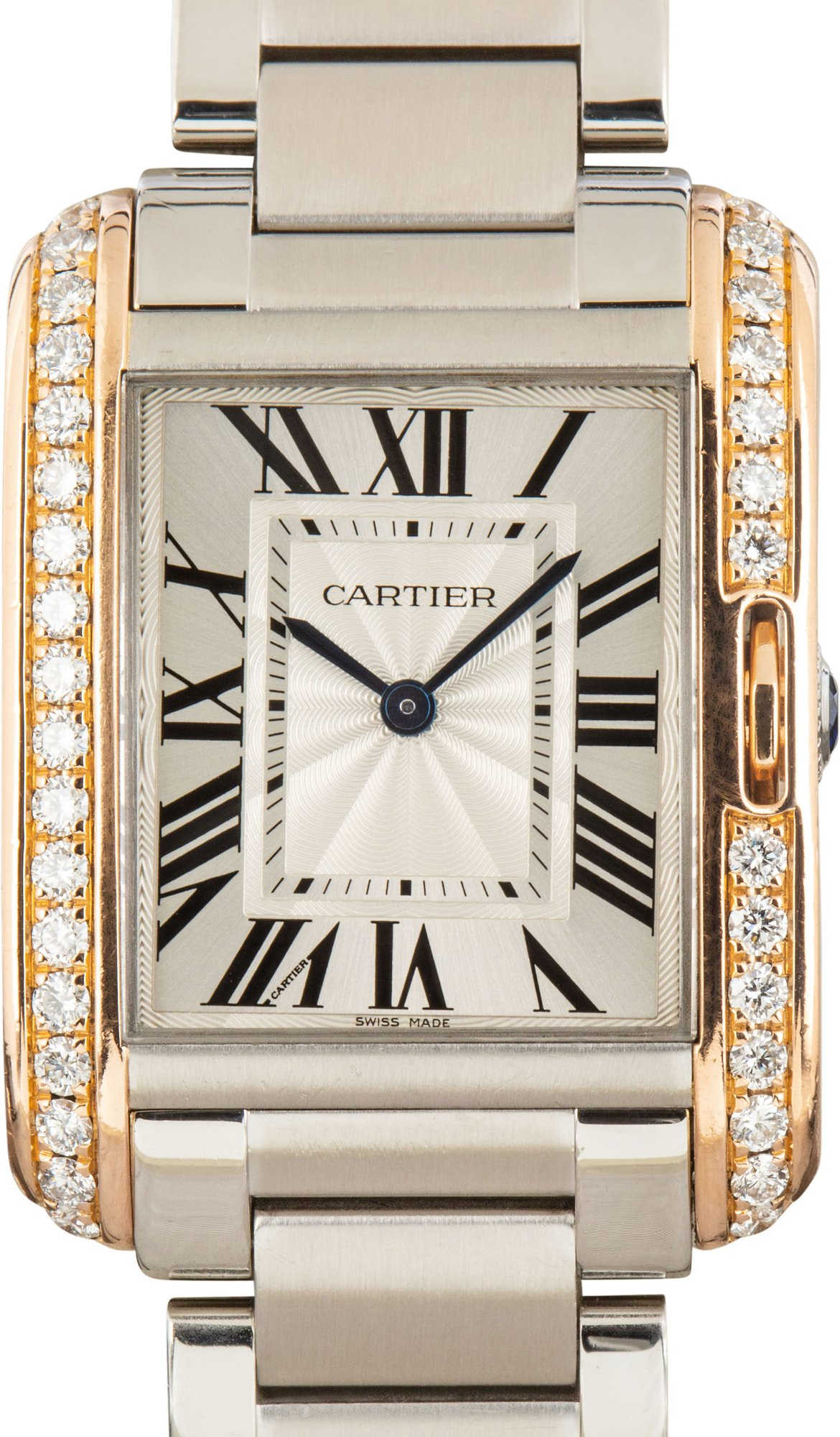 Cartier Tank Anglaise W3TA0003 (2016). This elegant Tank Anglaise features a 34.7 x 26.2 mm steel case with an 18kt rose gold bezel set with 32 diamonds, adding a refined touch of luxury. The silver Roman numeral dial complements the two-tone steel and rose gold construction, while a precise quartz movement ensures reliable timekeeping. The steel bracelet fits up to a 6.5-inch wrist.
