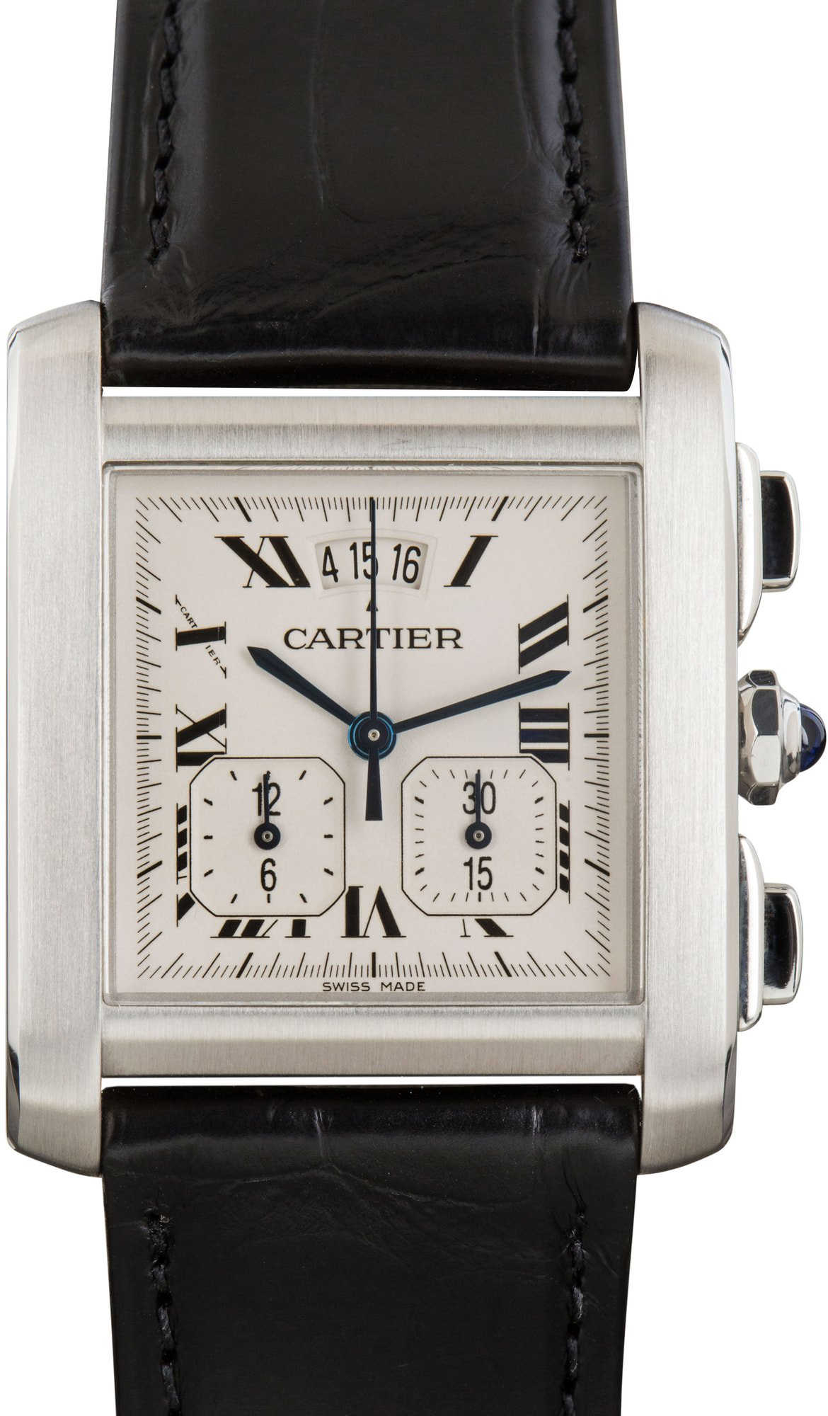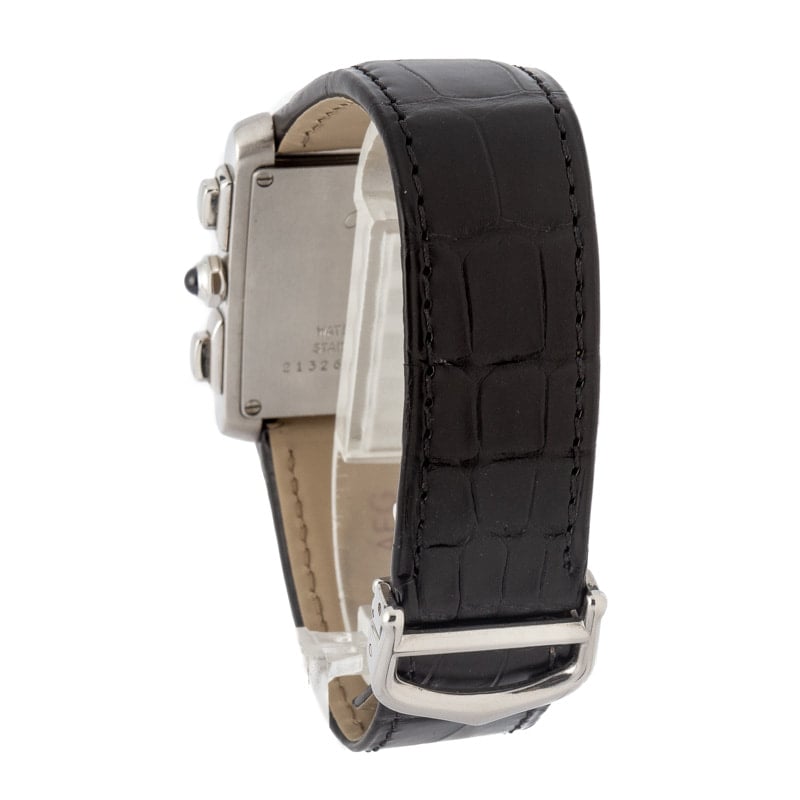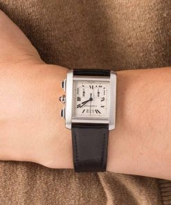 This Cartier Tank Française XXL ref. W5101455 (circa 2000) blends classic Tank design with practical functionality. Its 28 x 30mm stainless steel case houses a dial with date and chronograph features, powered by a precise quartz movement. Presented on a leather strap, this timepiece exemplifies Cartier’s iconic rectangular silhouette and timeless elegance, offering both style and everyday versatility for collectors and enthusiasts alike.