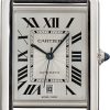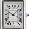 This Cartier Tank Must WSTA0040 delivers a bold, contemporary take on Cartier’s iconic rectangular silhouette. The extra-large 41 x 31mm stainless steel case houses a silvered flinqué dial detailed with blued sword-shaped hands and a date display at 6 o’clock. A beaded crown set with a synthetic cabochon-shaped spinel adds a touch of classic Cartier flair, while the black leather strap and steel folding buckle offer a refined, tailored fit. Slim at just 8.4mm and water-resistant to 30 meters, this Tank Must blends modern proportions with timeless Parisian elegance.