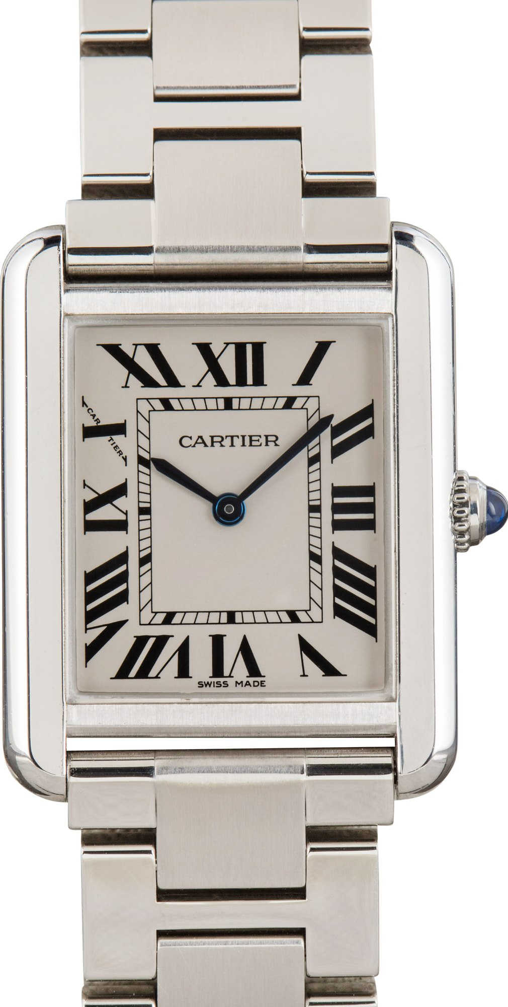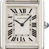 Cartier Tank Solo Small Model exudes timeless elegance with a 31mm x 24.4mm stainless steel case, complemented by a crisp opaline silver dial and bold Roman numeral hour markers. Powered by a reliable quartz movement, this watch combines classic Cartier design with modern precision. The stainless steel bracelet fits wrists up to 7 inches, making this Tank Solo a refined and versatile addition to any collection.