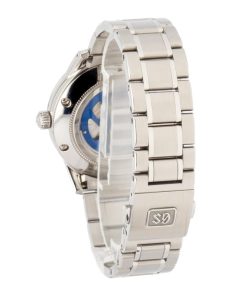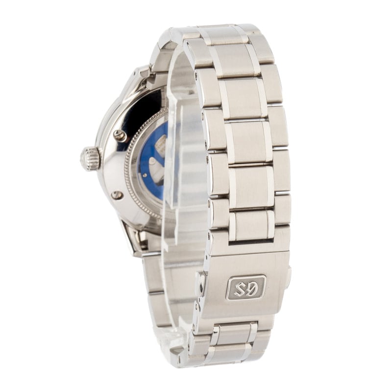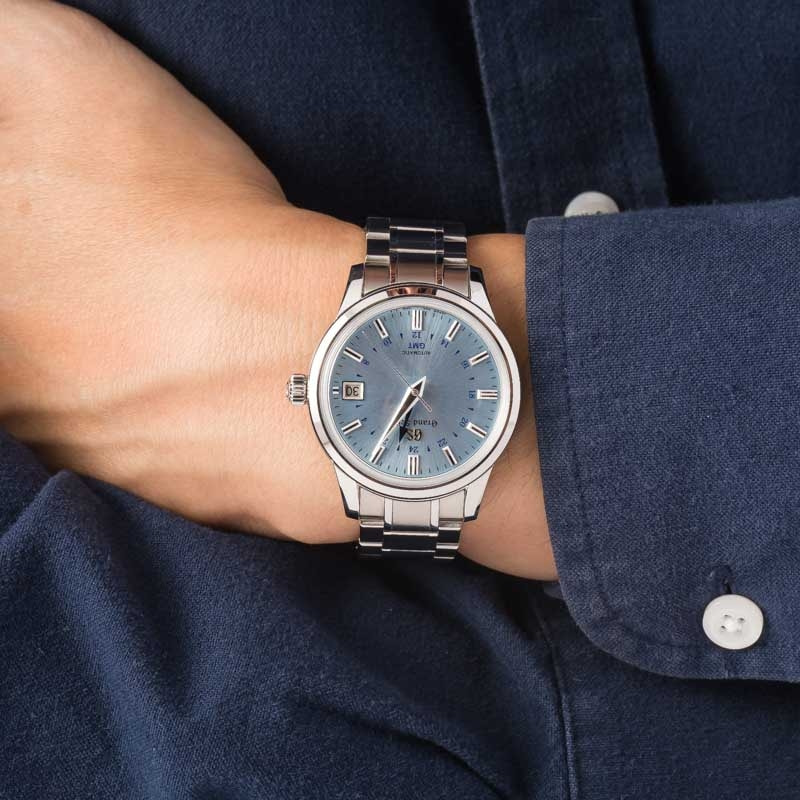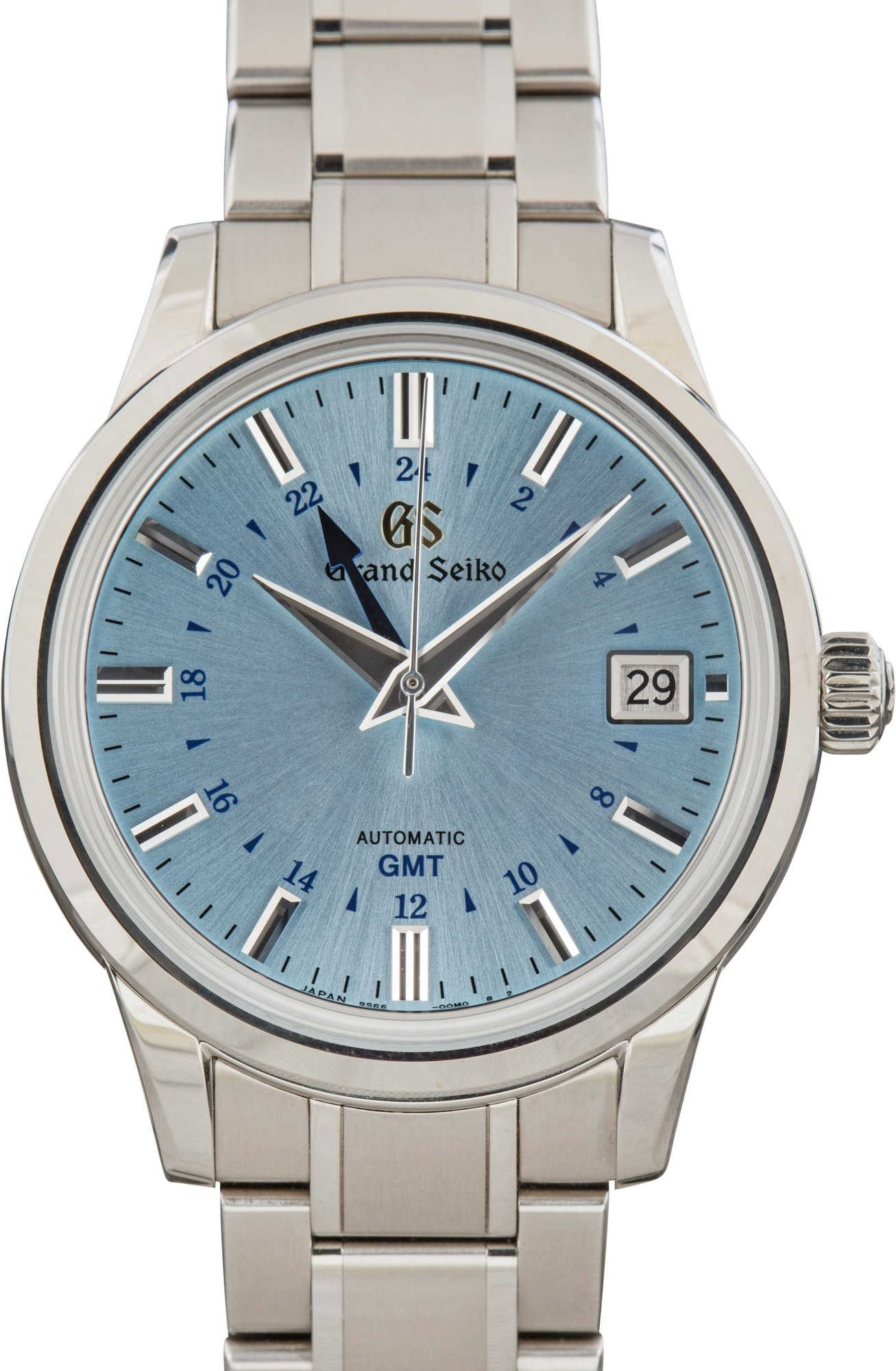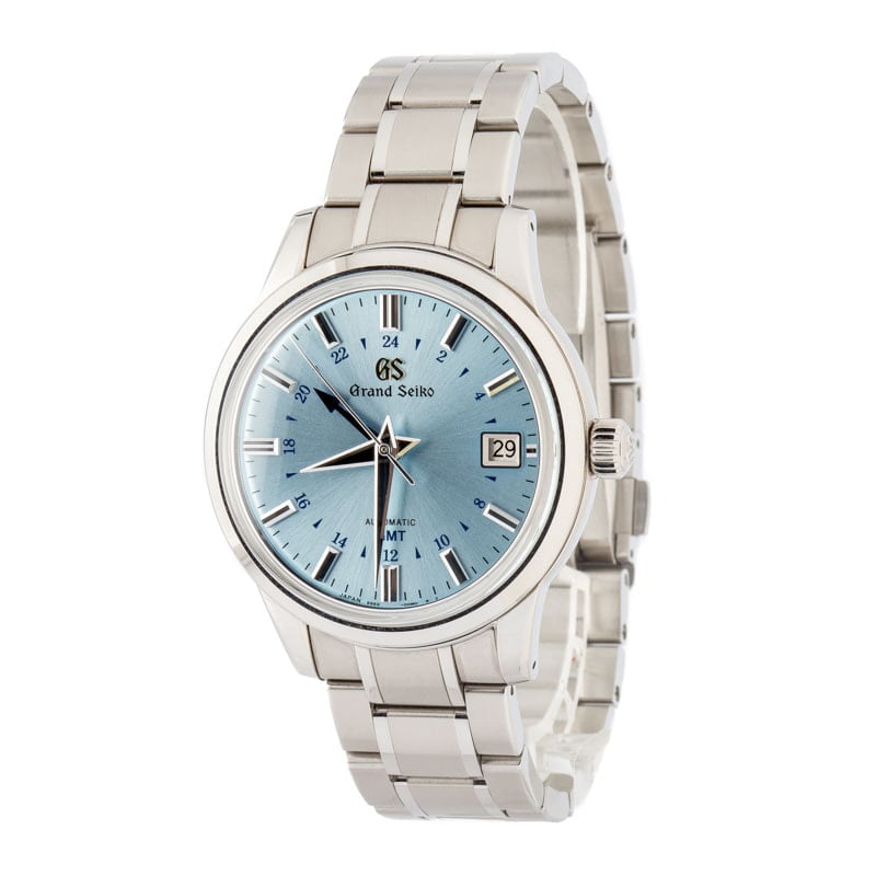 This 2025 Grand Seiko SBGM253 is a limited-edition release celebrating 25 years of the Calibre 9S movement, featuring a pale blue sunray dial inspired by the skies above Mt. Iwate with a tempered blue GMT hand and 24-hour scale. The 39.5mm stainless steel case showcases Zaratsu-polished lugs, a box-shaped sapphire crystal, and a see-through case back revealing the automatic Calibre 9S66 with a 72-hour power reserve and anodized titanium oscillating weight. Engraved LIMITED EDITION with a unique serial number, this refined dual-time piece offers collectible appeal and fits up to a 7.25-inch wrist.