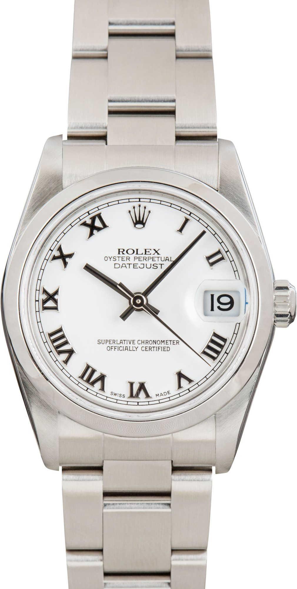 Ladies Rolex Datejust ref. 78240 (2005–2006) offers classic elegance in a 31mm stainless steel case. Featuring a white Roman dial and a smooth bezel, this Datejust is paired with an Oyster bracelet, combining timeless Rolex style with everyday comfort—perfect for collectors and daily wear alike.