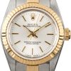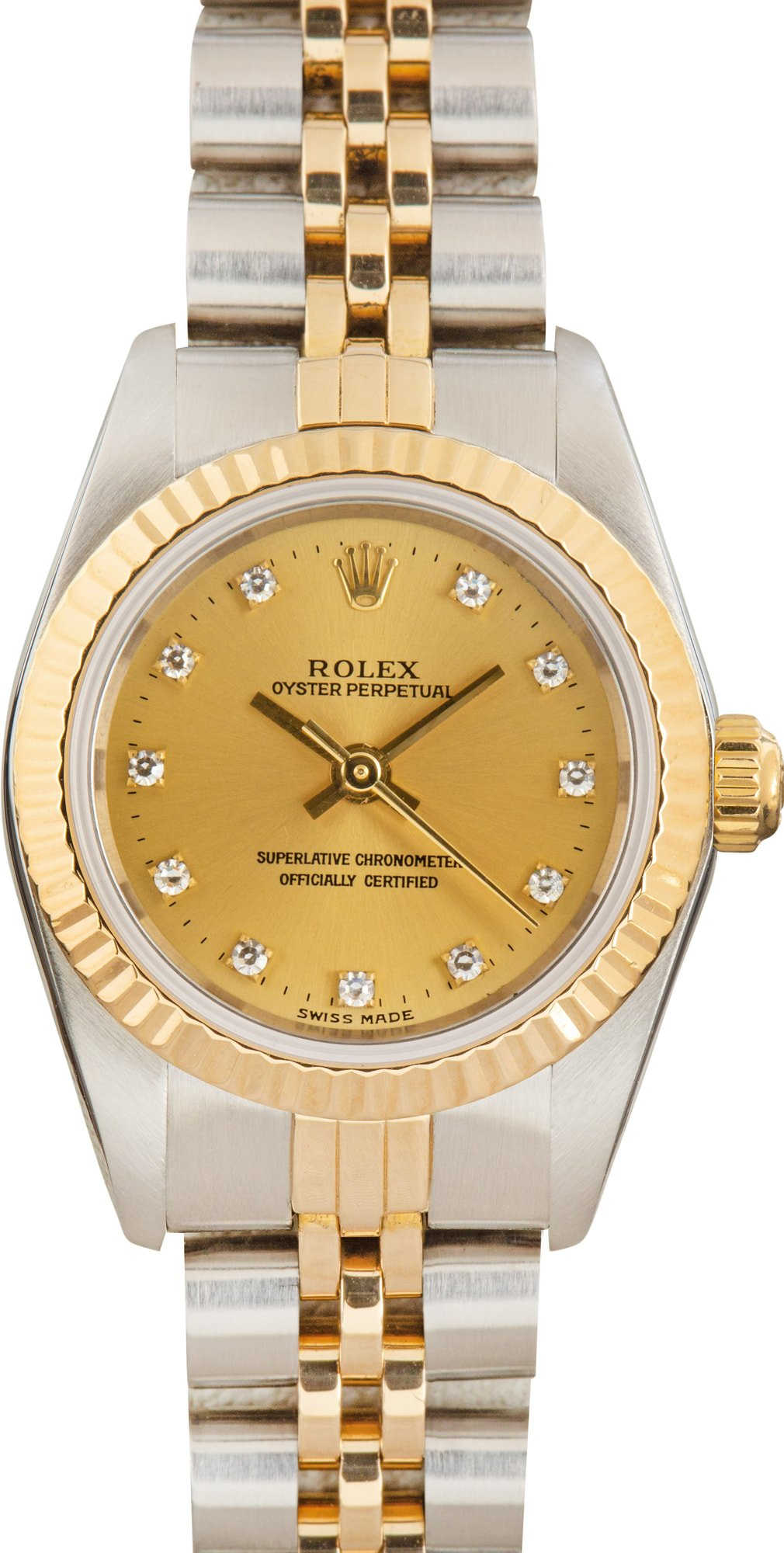 Exuding refined elegance, this 2000–2001 Ladies Rolex Oyster Perpetual ref. 76193 is the epitome of timeless sophistication. Crafted in a harmonious blend of stainless steel and yellow gold, the 24mm case beautifully frames a champagne dial adorned with brilliant diamond hour markers. Paired with a graceful Jubilee bracelet, this exquisite timepiece offers a perfect balance of understated luxury and classic Rolex heritage—ideal for those who appreciate distinguished style in a more delicate, compact form.