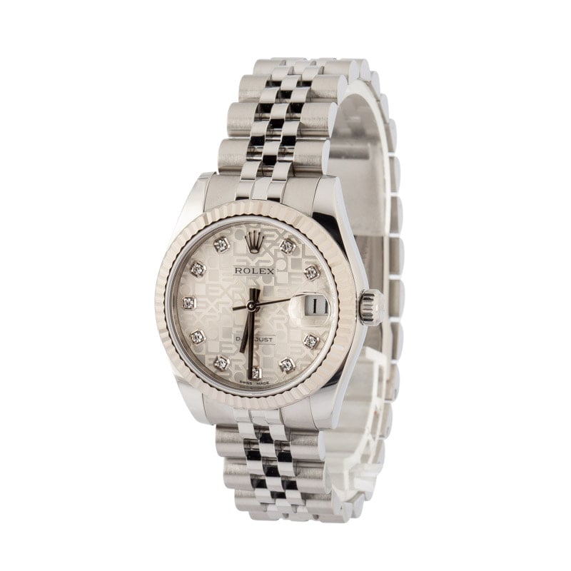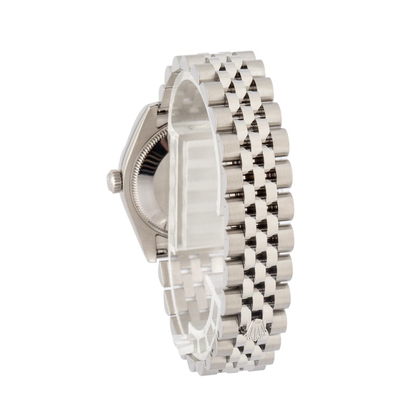This exquisite 31 mm timepiece is beautifully crafted in Oystersteel, paired with an 18k white‑gold fluted bezel. The silver “Jubilee”‑finish dial features sparkling diamond hour markers and a date display at 3 o’clock. Powered by Rolex’s automatic Calibre 2235 and mounted on a stainless steel bracelet, it merges timeless elegance with exceptional build quality.