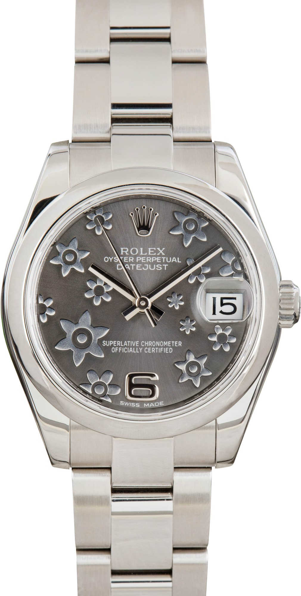 Sophisticated and elegant, this 2018 Rolex Datejust 31 Ref. 178240 features a 31 mm stainless steel case paired with a unique slate floral dial that adds a touch of artistry to classic design. Powered by the Rolex Calibre 2236 automatic movement with quickset date, it delivers precise and reliable timekeeping. The Oyster bracelet ensures comfort and durability, while the scratch-resistant sapphire crystal and 100 m water resistance make this Datejust as practical as it is striking—a perfect blend of style and everyday versatility.