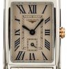 This Longines DolceVita ref L5.255.4.87.6 is a graceful blend of luxury and elegance. Its rectangular stainless steel case frames a luminous white mother-of-pearl dial adorned with 13 Top Wesselton VS-SI diamonds, adding just the right amount of sparkle. Blued steel hands glide over the diamond hour markers, creating a striking contrast against the iridescent backdrop. With its slim 6.90 mm profile and scratch-resistant sapphire crystal, this watch is as practical as it is refined—perfect for those who appreciate timeless sophistication.
